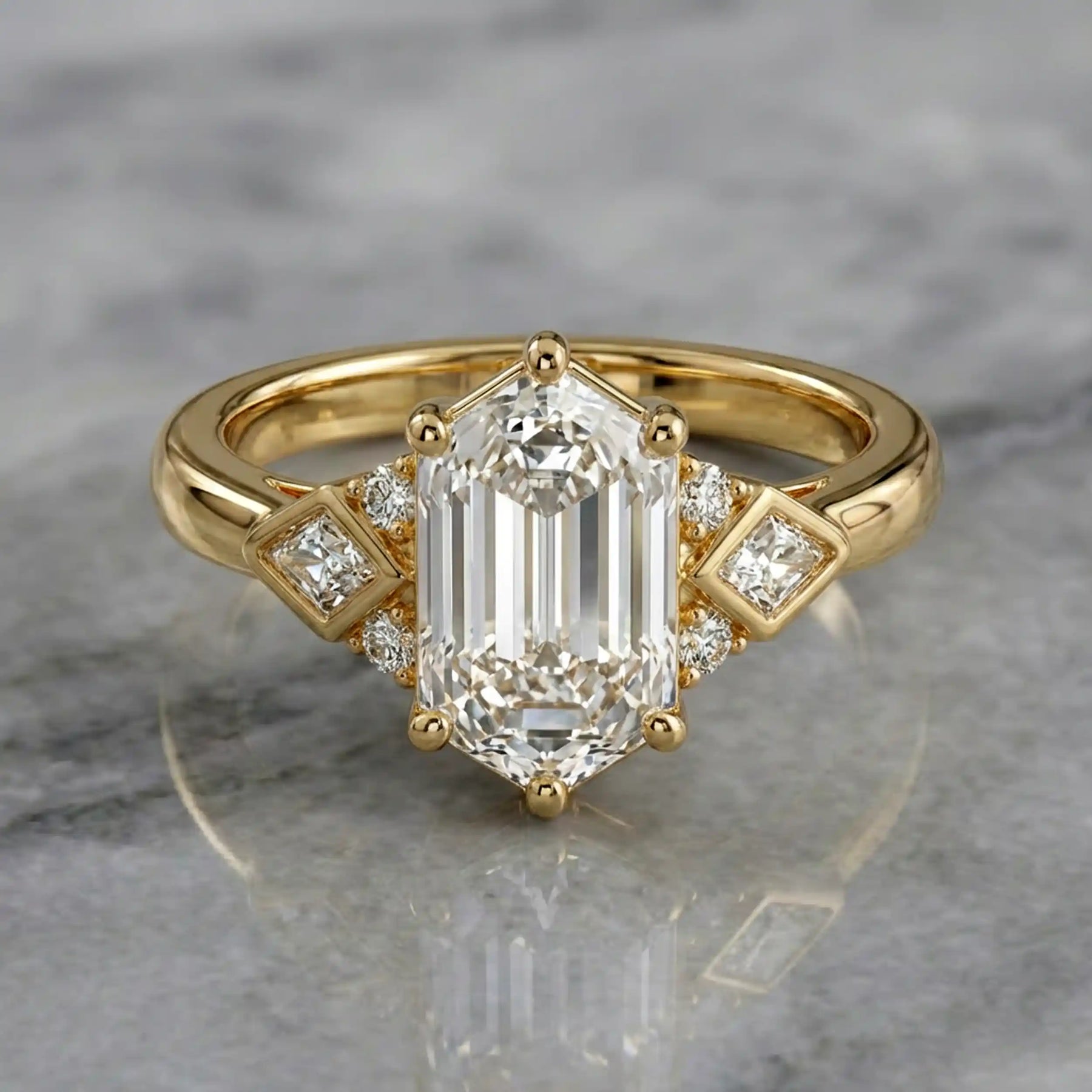 This elongated hexagonal lab-grown diamond engagement ring is crafted for those who appreciate distinctive beauty with refined elegance. The striking center stone commands attention, while the carefully placed side stones enhance depth, sparkle, and balance.
