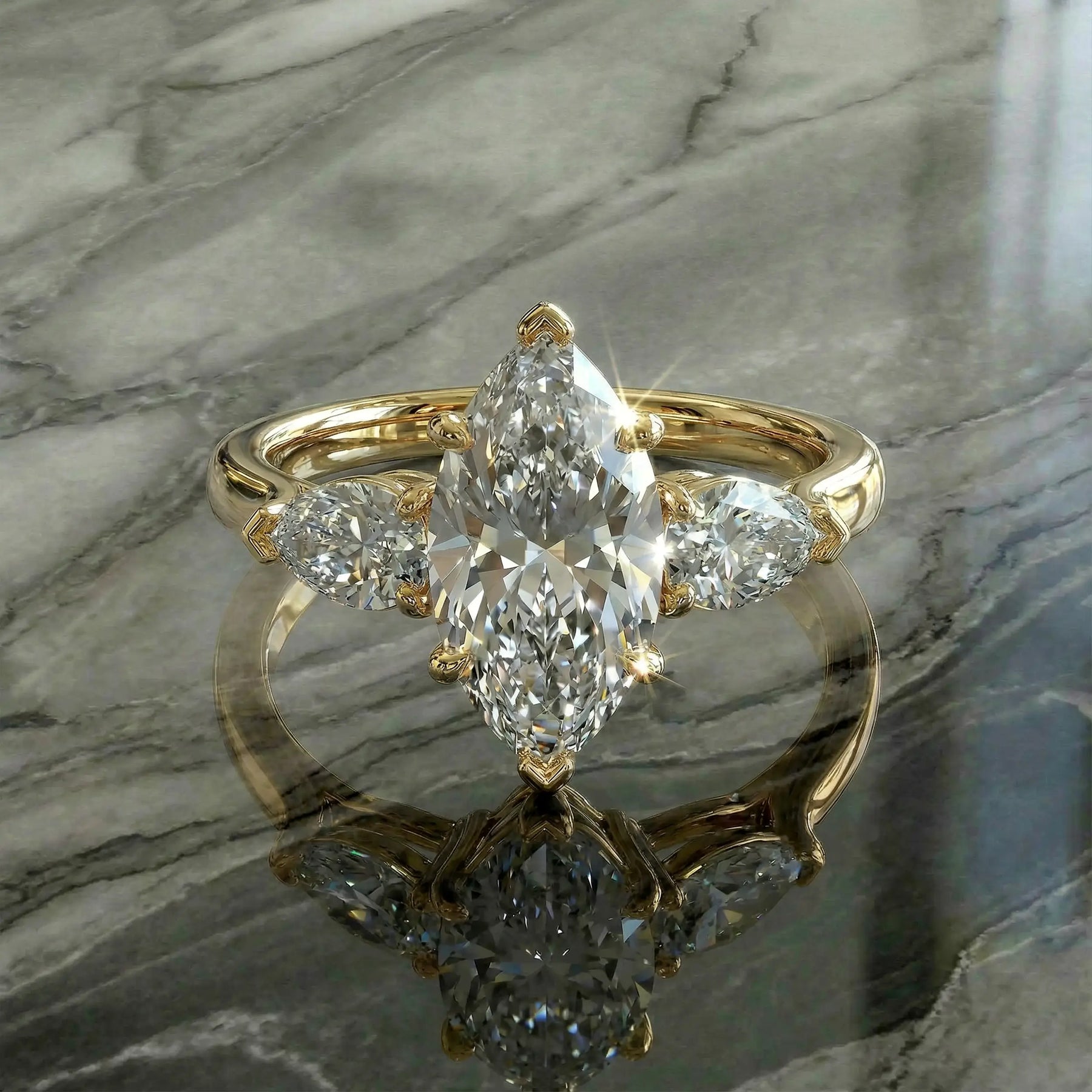 This three-stone marquise engagement ring is designed to capture light, emotion, and meaning in one unforgettable piece. At the center, a luminous marquise-cut lab-grown diamond creates a bold yet refined presence, symbolizing the future you’re building together.