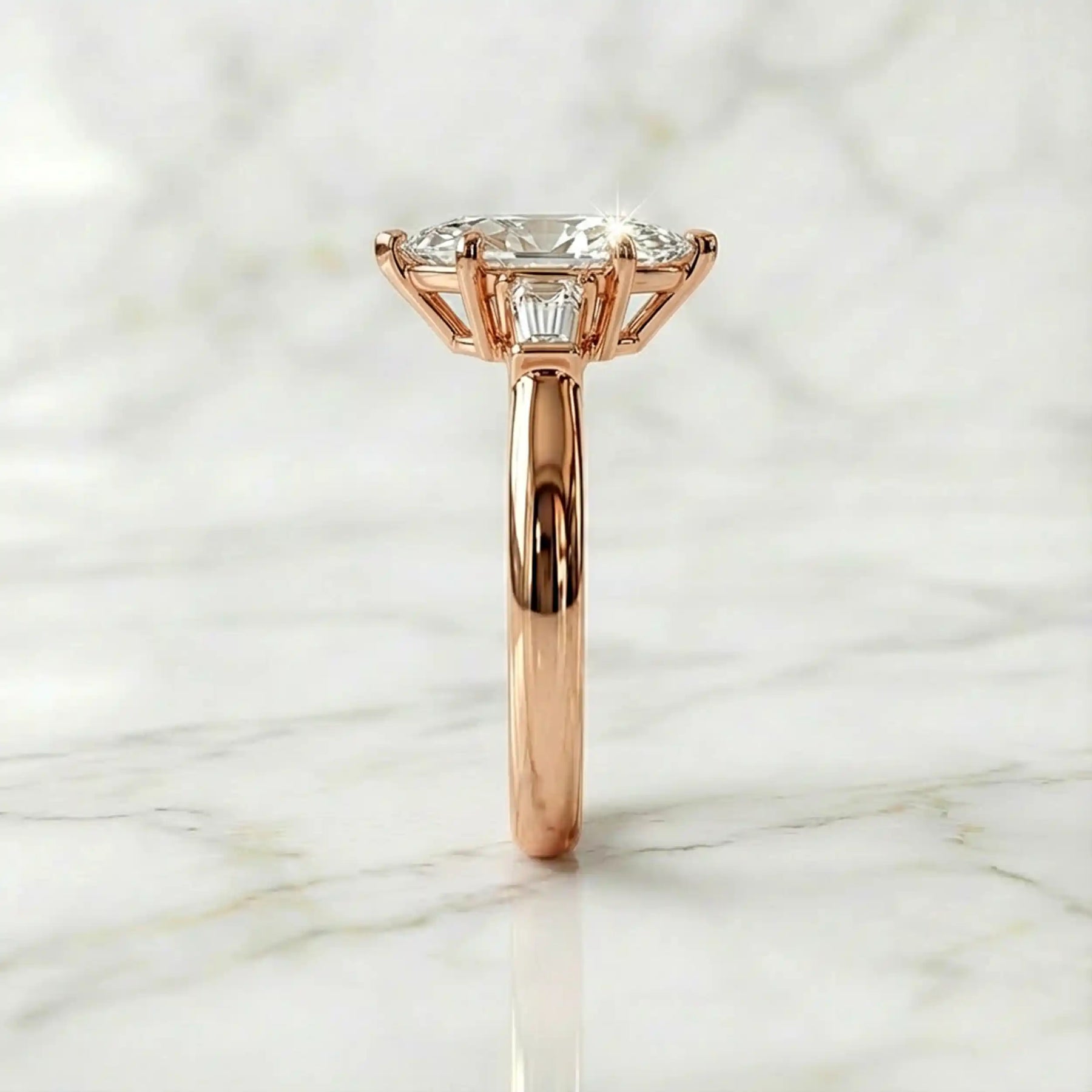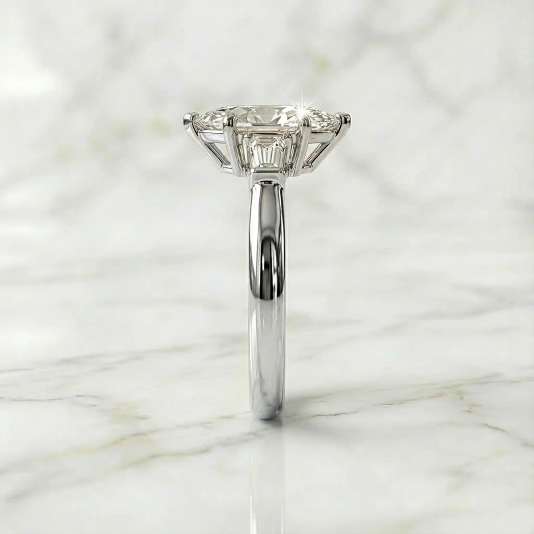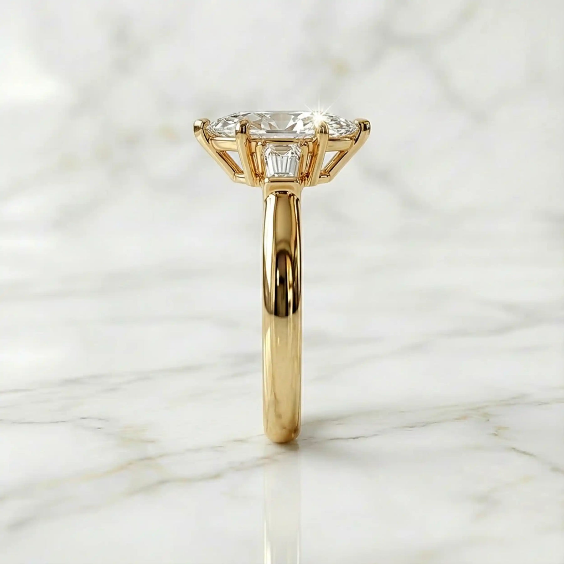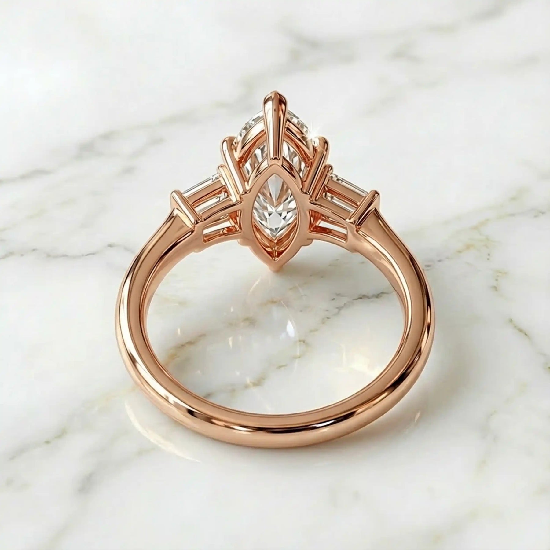 This three-stone engagement ring is designed to celebrate your past, present, and future in one breathtaking design. At the center, a luminous lab-grown marquise diamond commands attention with its elongated brilliance, beautifully framed by tapered baguette side stones that enhance its refined silhouette.