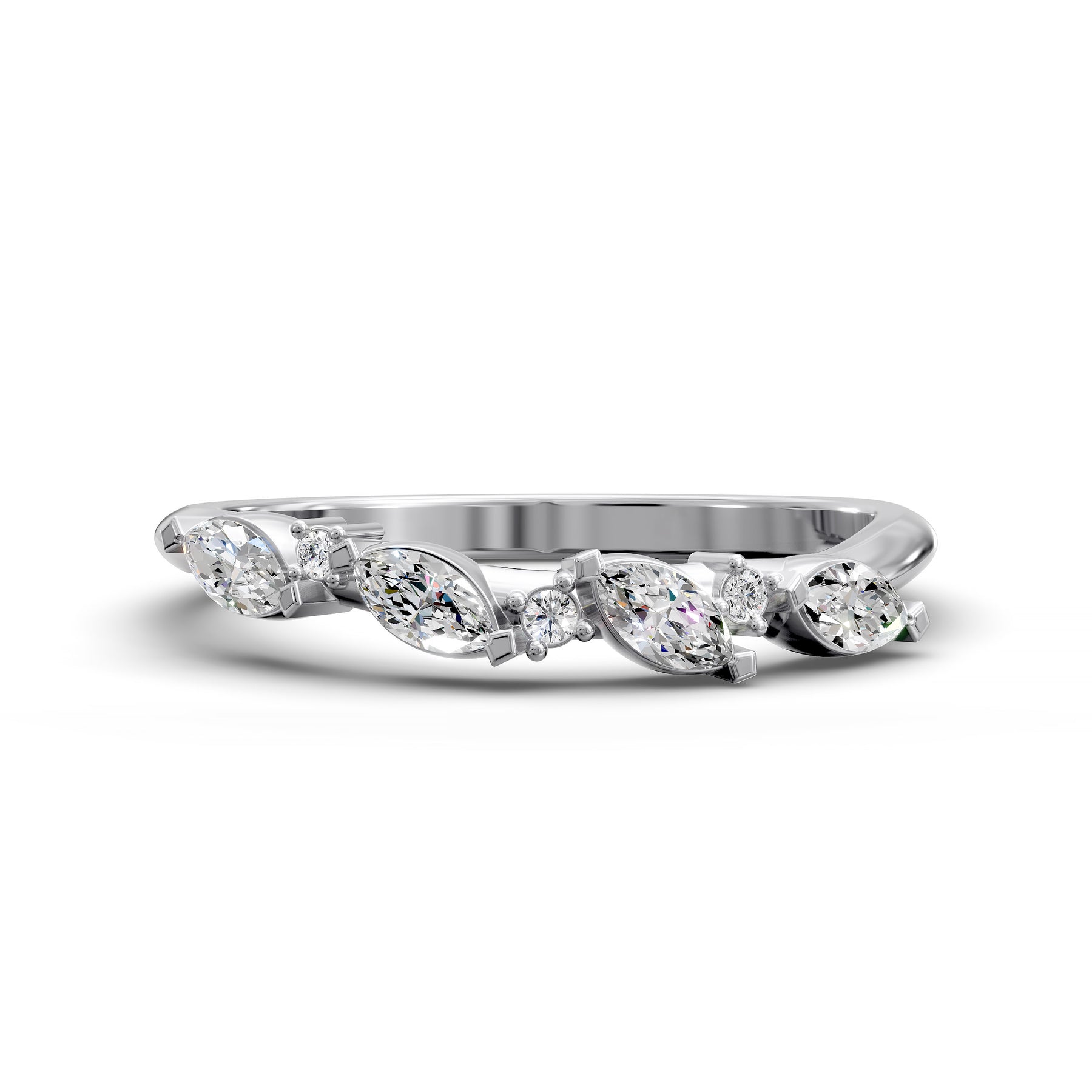 This “curved wedding band with marquise & round diamonds” incorporates the main keyword naturally while emphasizing craftsmanship, contour fit and radiant mixed-cut sparkle.