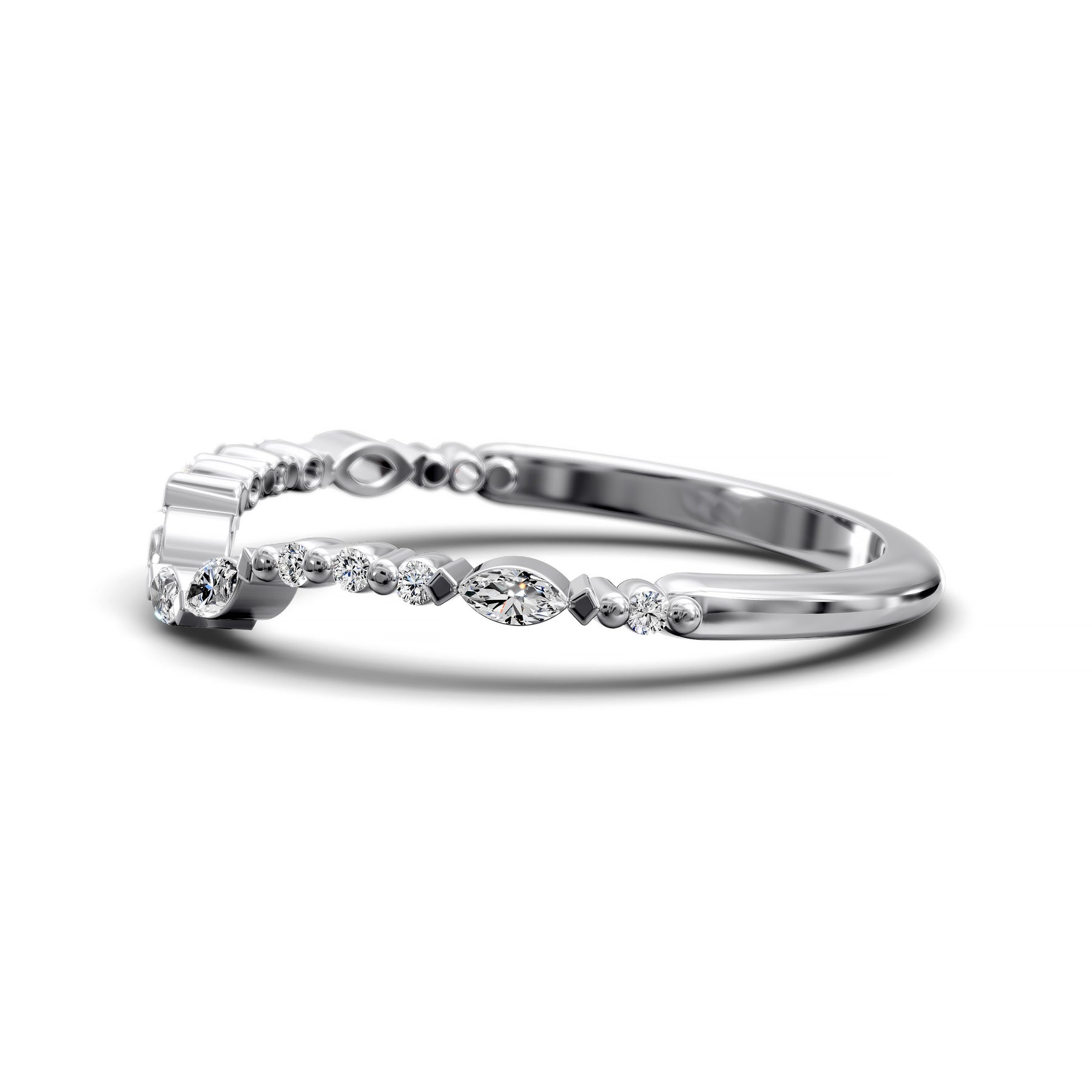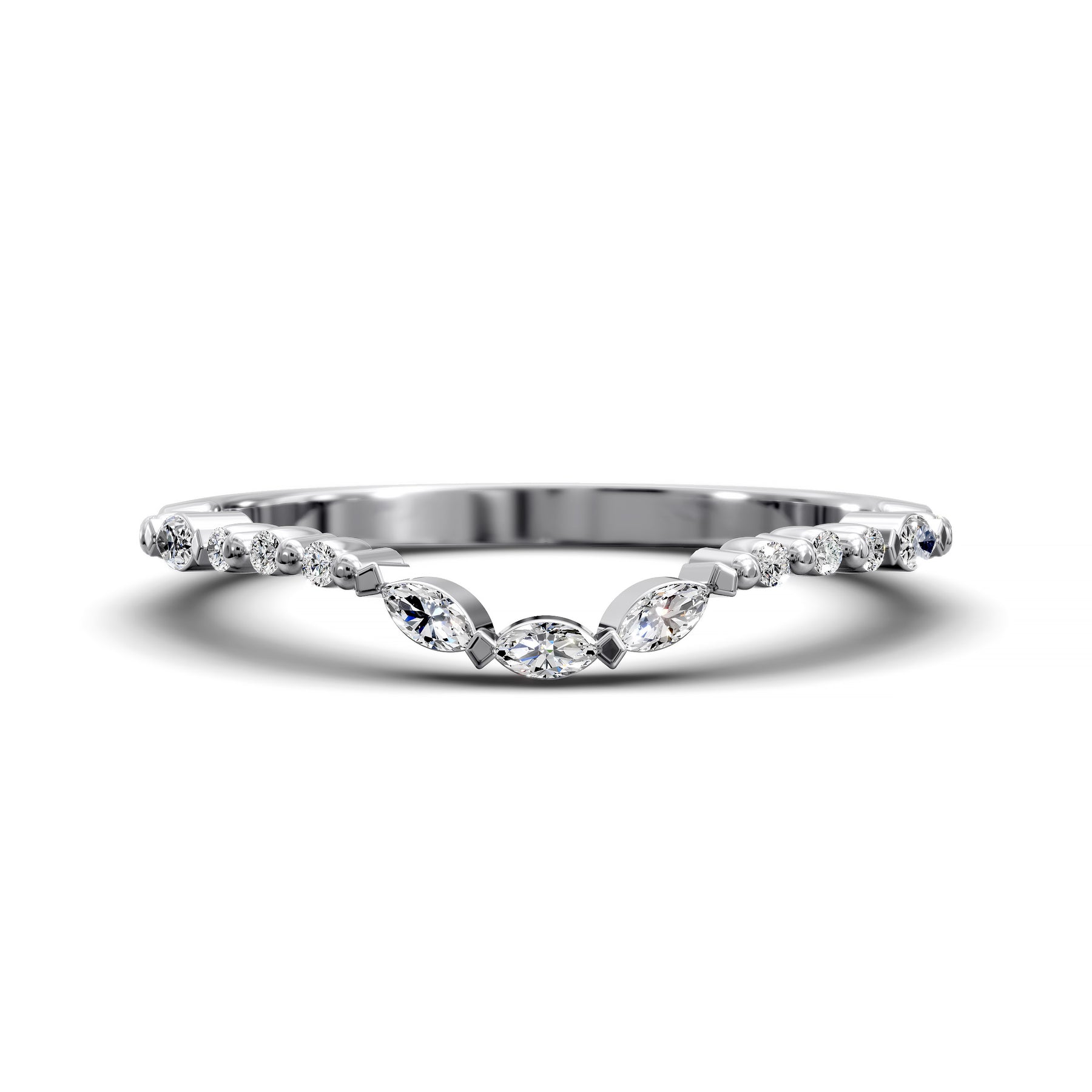 Introducing the Marquise & Round Shared-Prong Curved Wedding Band – Elegant Bridal Ring: a beautifully balanced design featuring alternating marquise-cut and round-cut stones in a shared-prong setting, all set within a gentle curve that complements your engagement ring flawlessly.