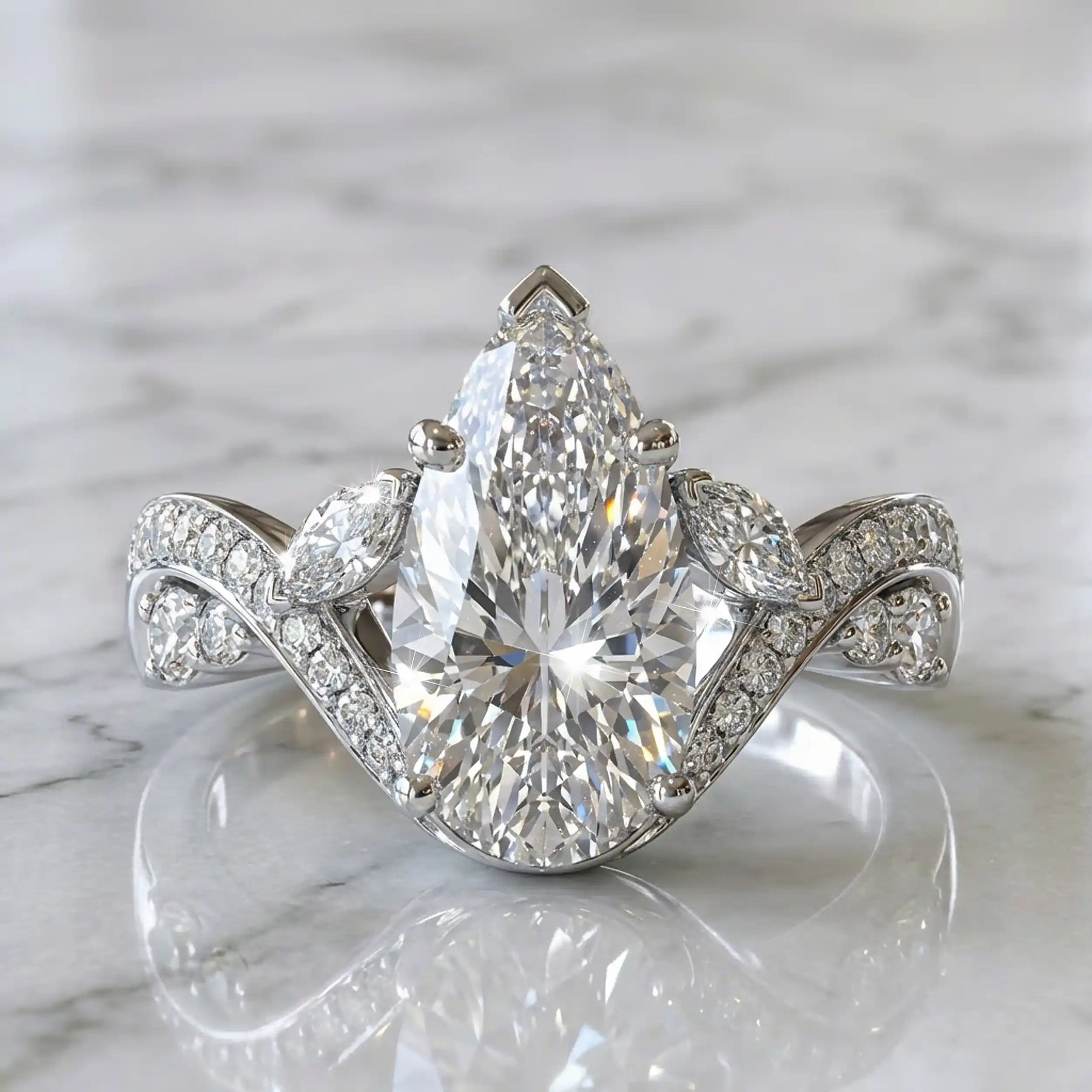 This pear lab-grown diamond engagement ring captures the beauty of timeless romance with a graceful twisted three-stone design. At its center, a striking 3 carat pear lab-grown diamond radiates brilliance, framed by delicate accent stones that shimmer from every angle.