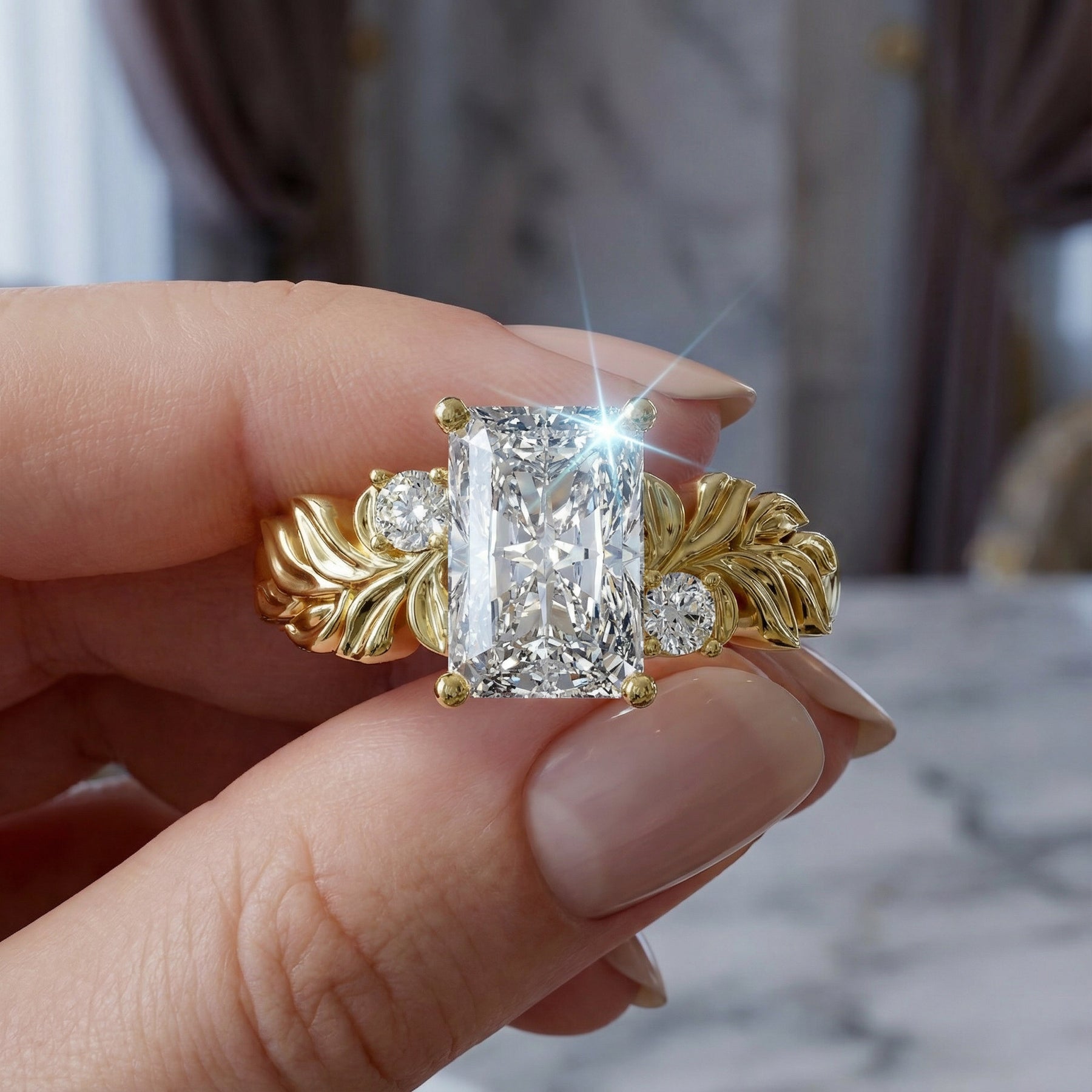 Inspired by natural beauty and timeless elegance, this 2.2 carat radiant cut diamond engagement ring features intricate leaf motifs that frame the center stone with organic grace. The radiant diamond delivers exceptional brilliance, while the sculpted details add artistry and symbolic meaning, celebrating growth, connection, and new beginnings.