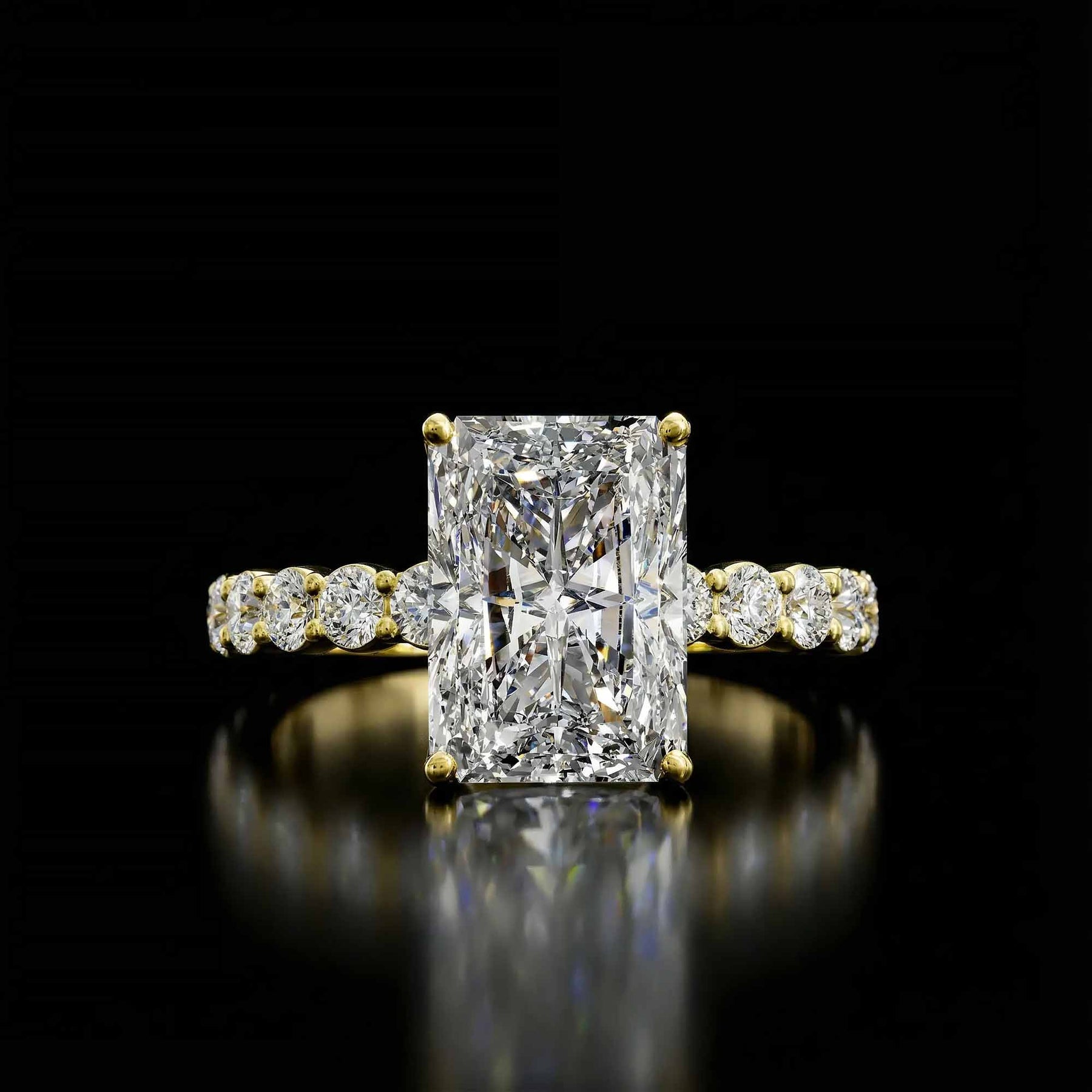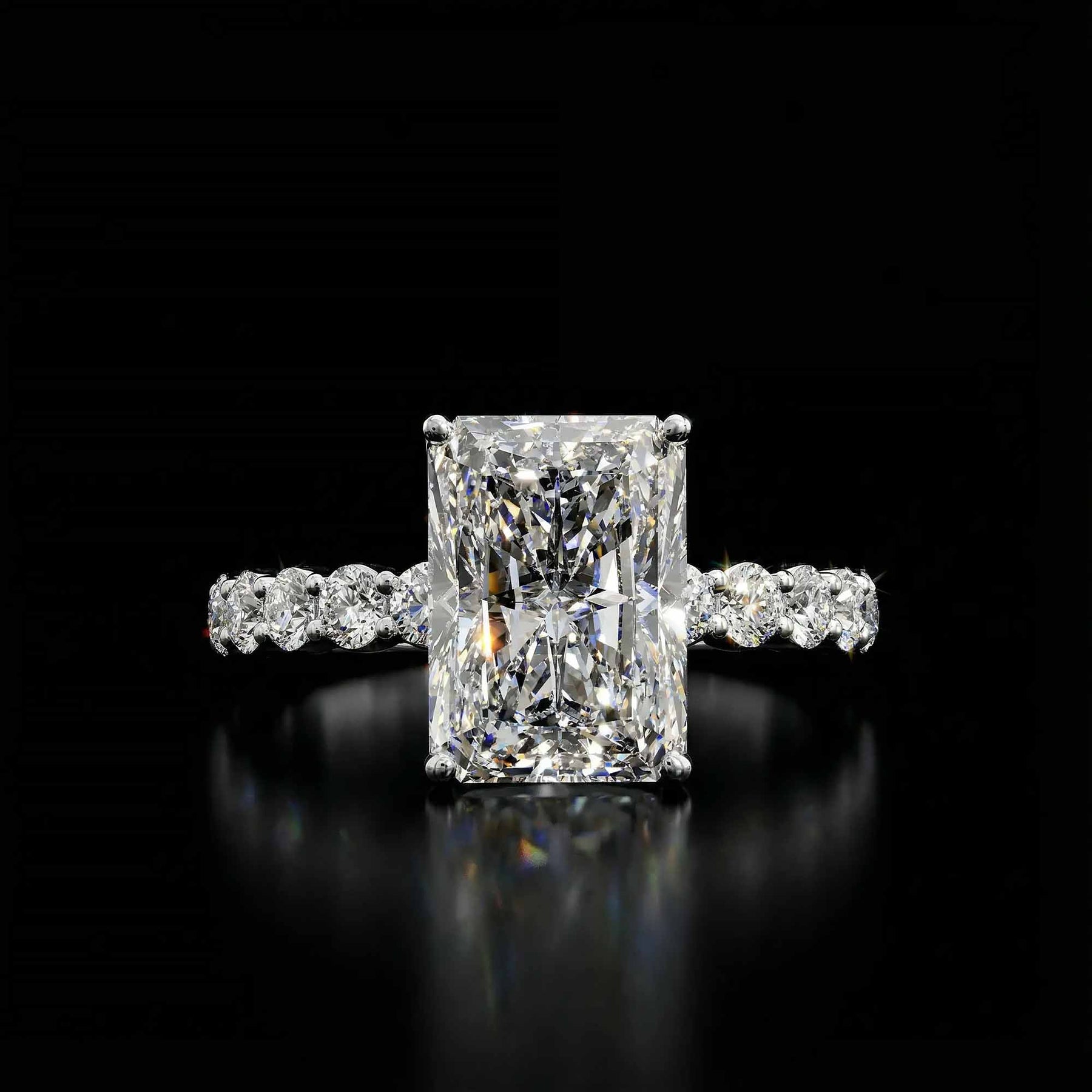 Experience a mesmerizing blend of brilliance and craftsmanship with this 4.7 carat radiant diamond engagement ring. The elongated radiant center stone glows with exceptional fire, while the hidden halo adds subtle luminosity that reveals itself with every angle. A diamond-accented band enhances its presence, creating a look that feels regal, modern, and effortlessly romantic.