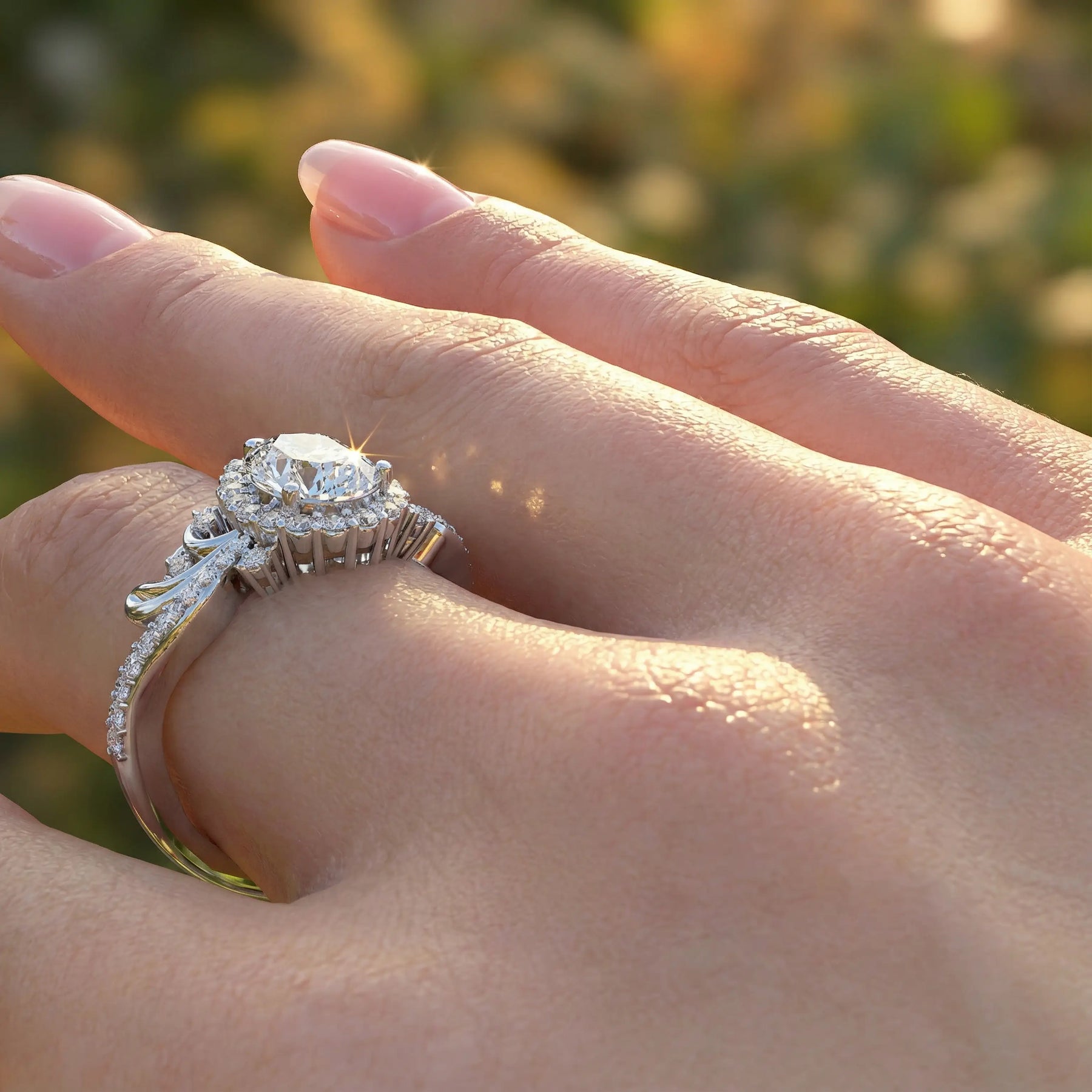 A romantic vintage-inspired engagement ring featuring a 1 carat pear-shaped center diamond embraced by a luminous halo and ornate sculpted detailing. This design blends antique elegance with modern craftsmanship for a look that feels timeless and deeply meaningful.