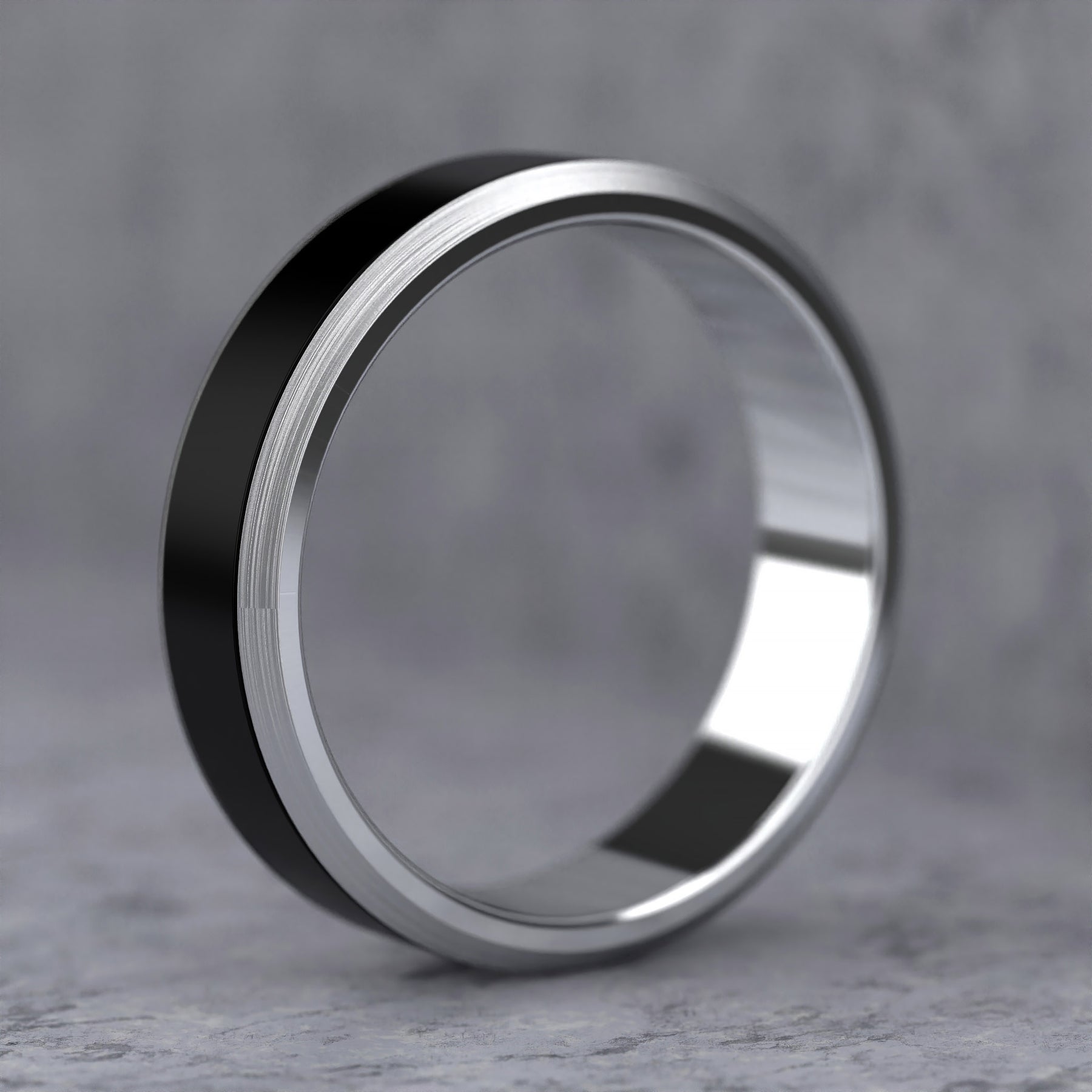 This sleek black enamel inlay band offers a bold, modern aesthetic perfect for those who appreciate clean lines and contemporary design. The smooth inlay creates a striking contrast against the brushed beveled edges, delivering a stylish balance of texture and shine. Its refined profile and comfortable interior make it a standout choice for daily wear or a distinctive wedding band alternative.