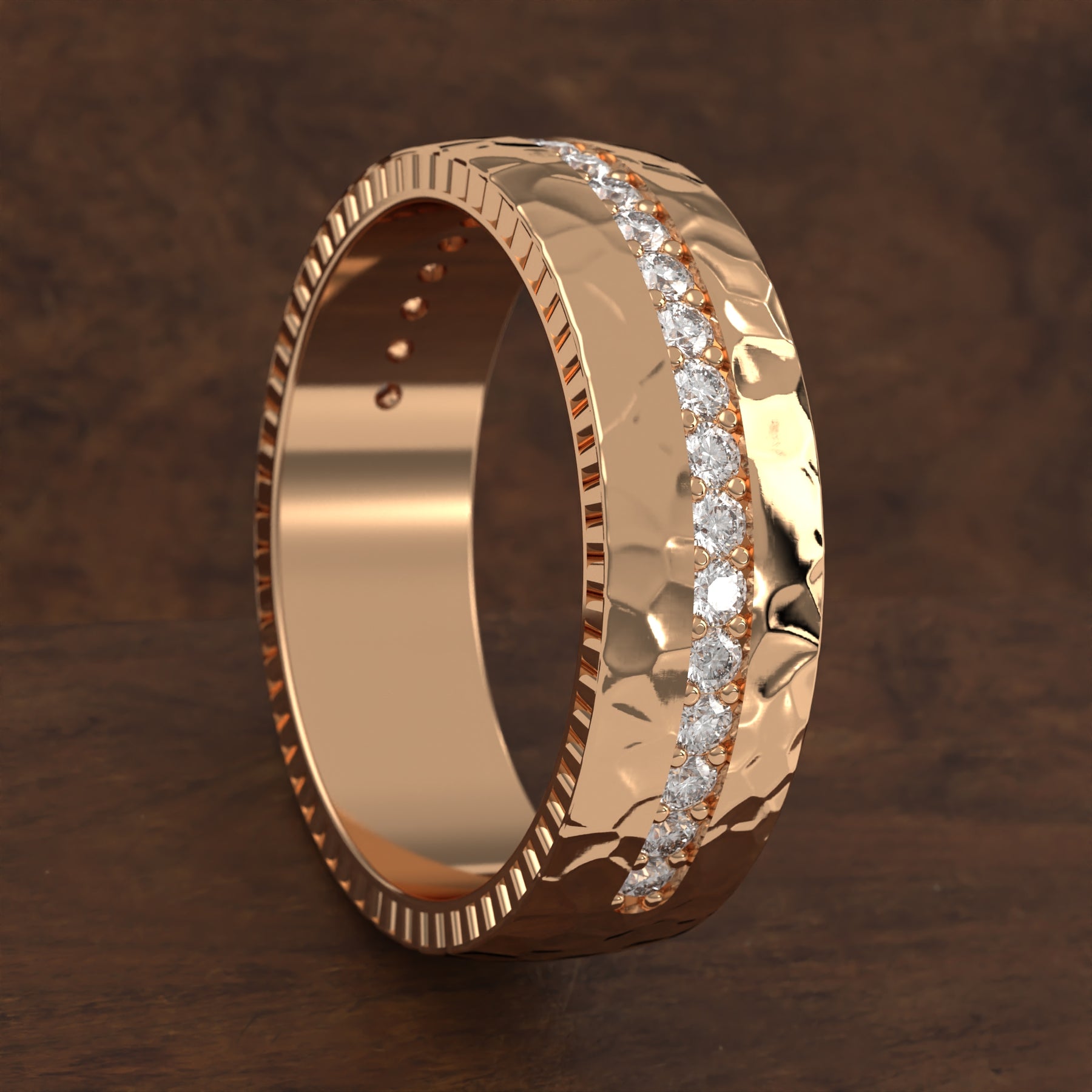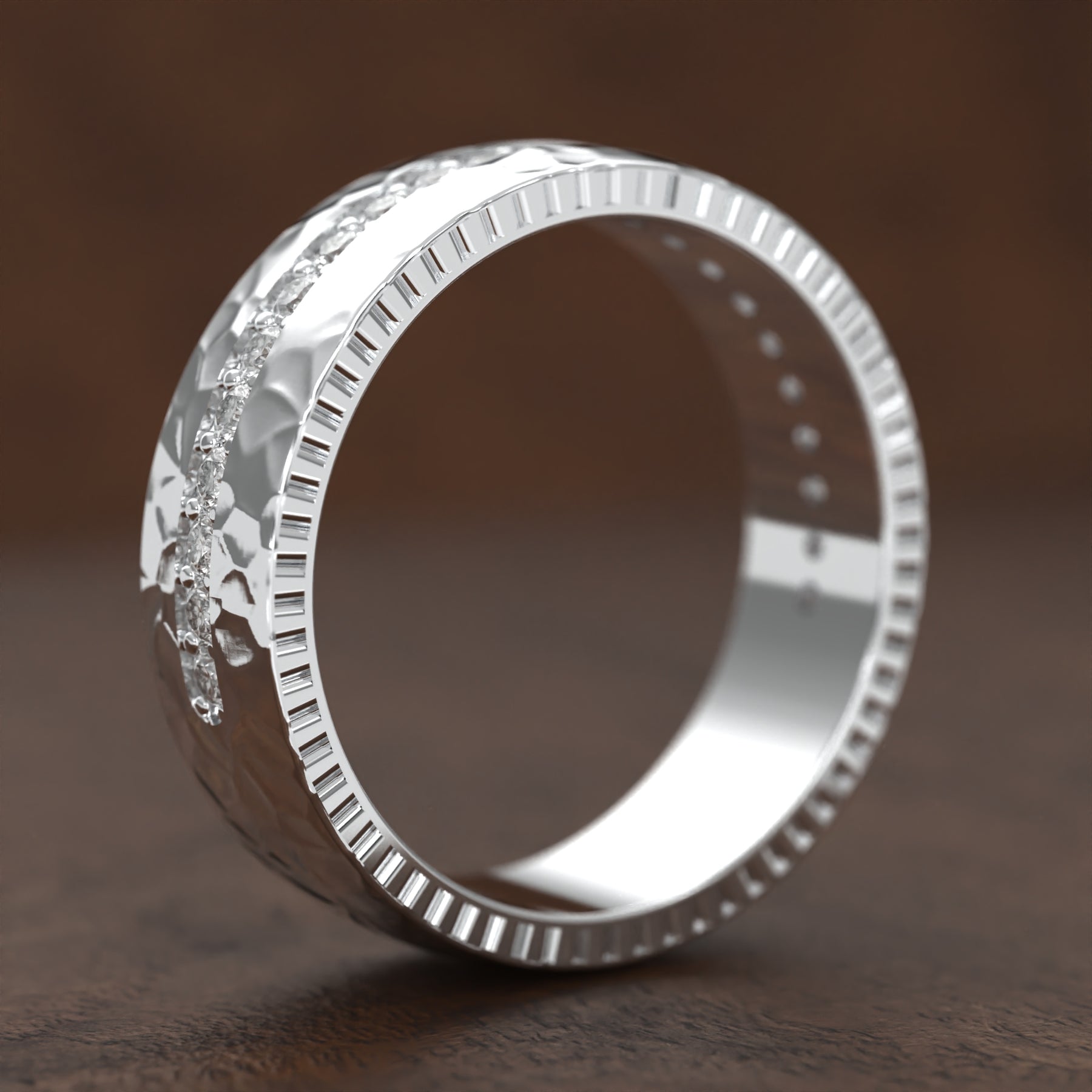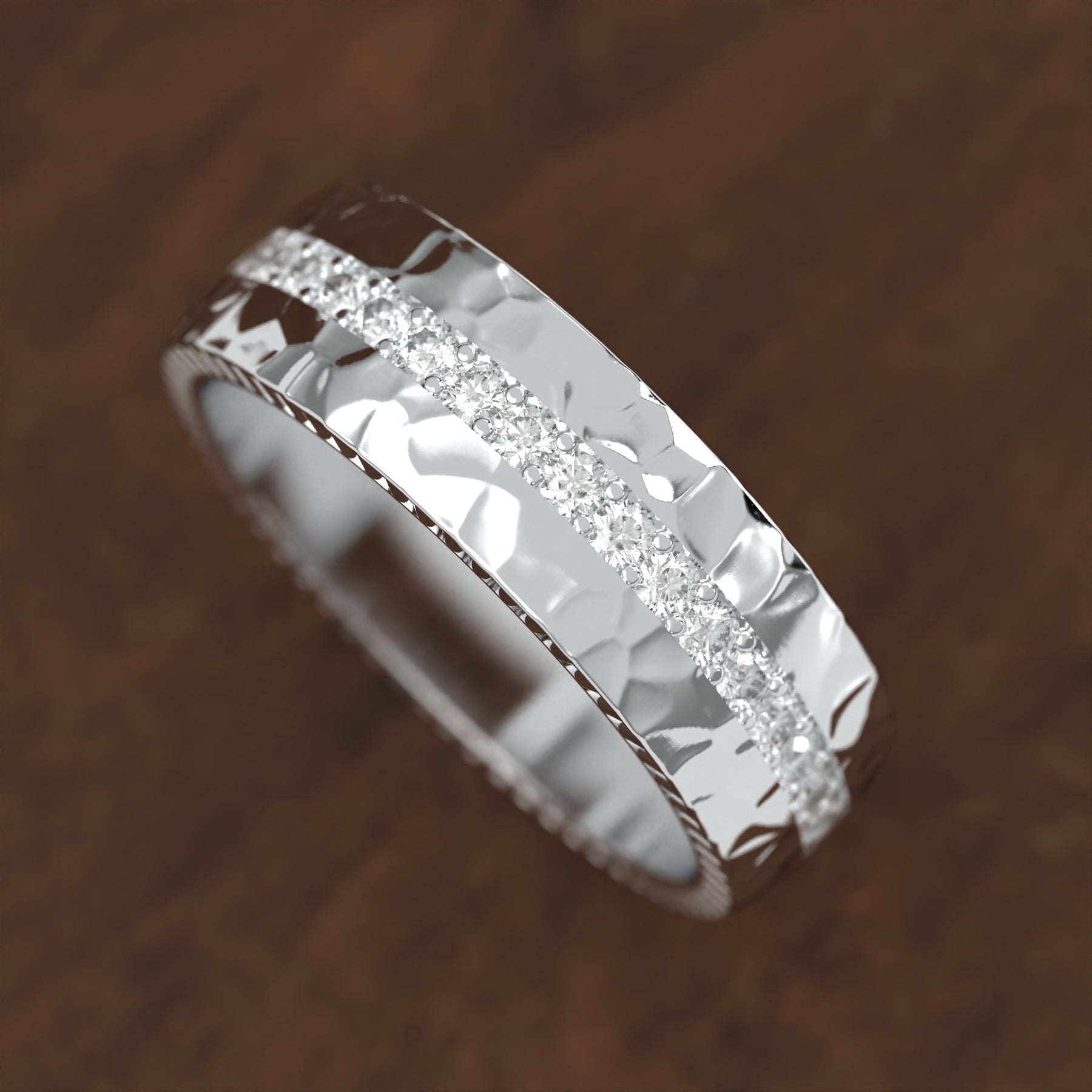 This striking half-round band features a bold hammered surface that creates a rich, reflective texture across the top. An extended channel row of sparkling diamonds runs cleanly through the center, adding brilliance that contrasts beautifully with the organic hammered detailing. The outer rim is finished with a refined textured edge pattern, giving the band a distinctive look that blends rugged style with polished sophistication.
