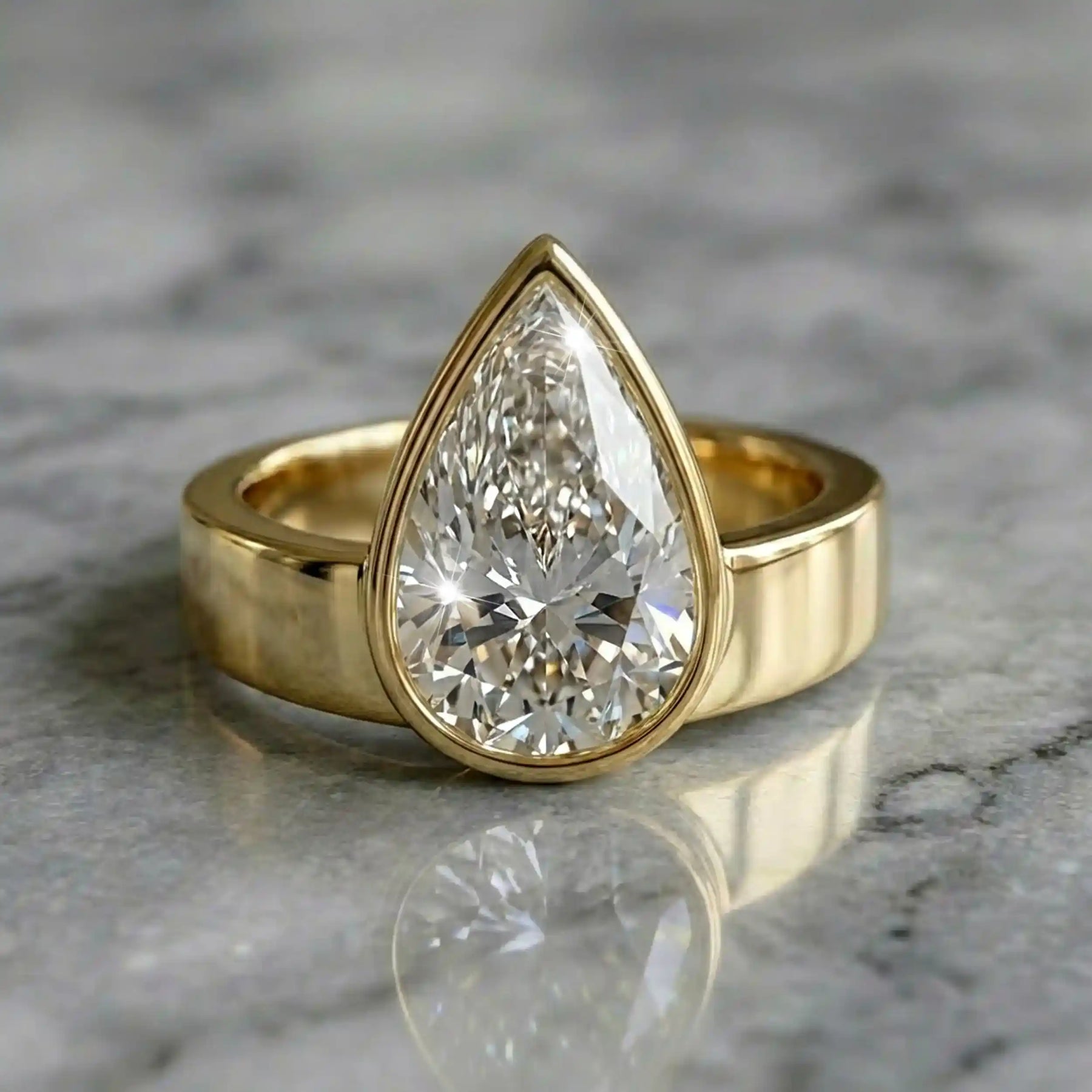 3 carat pear-shaped lab-grown diamond bezel solitaire engagement ring displayed on marble surface.