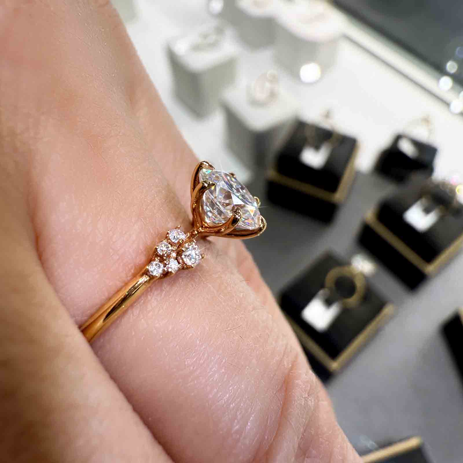 This engagement ring exudes simple elegance with its 6.5 mm round top-quality moissanite center stone. The brilliance of the central gem is accentuated by petite moissanite side stones, all beautifully mounted on a 14K rose gold band. The warmth of rose gold paired with the sparkle of moissanite creates a captivating effect, ensuring this ring stands out as a symbol of your love. Perfect for those who value sustainable luxury and timeless design.