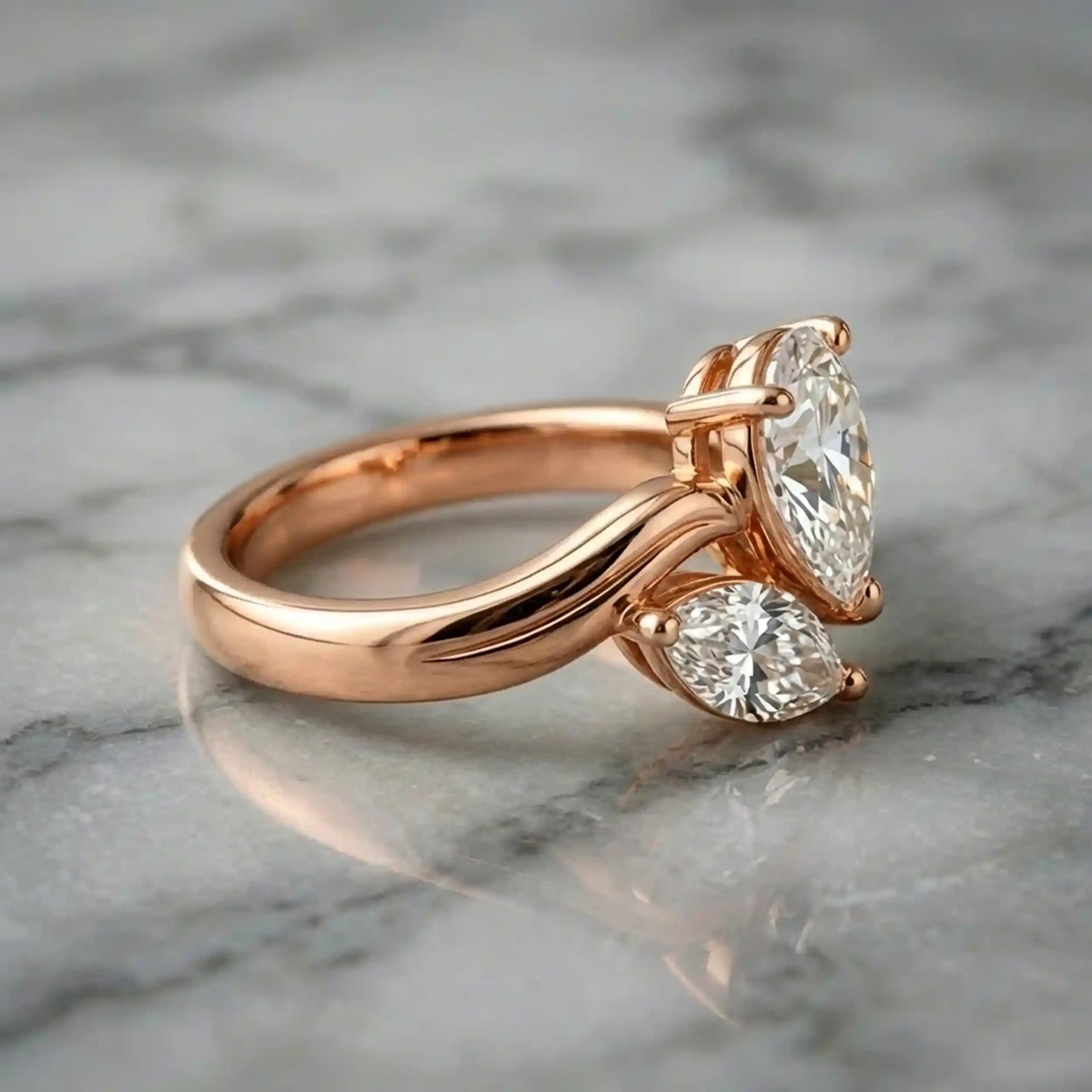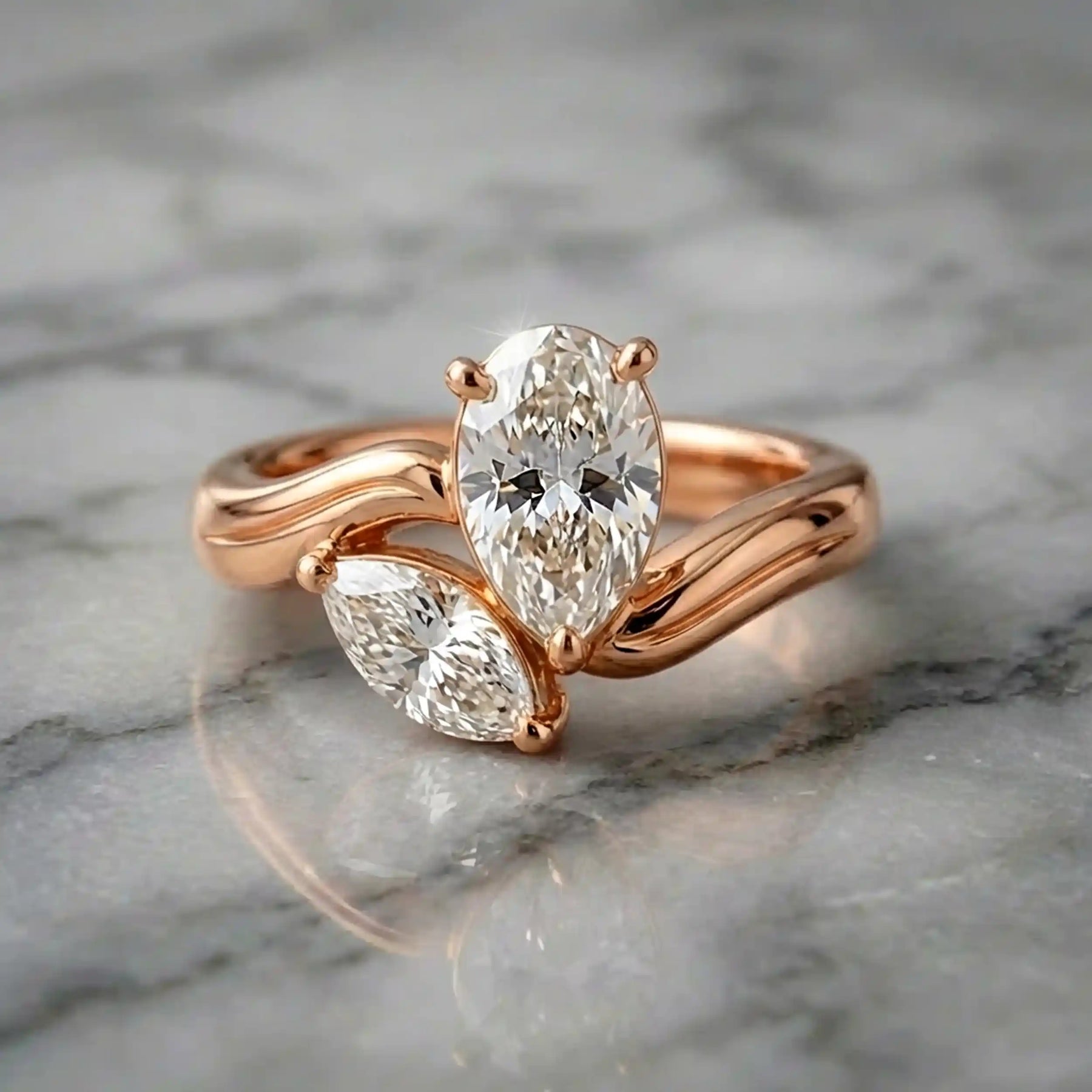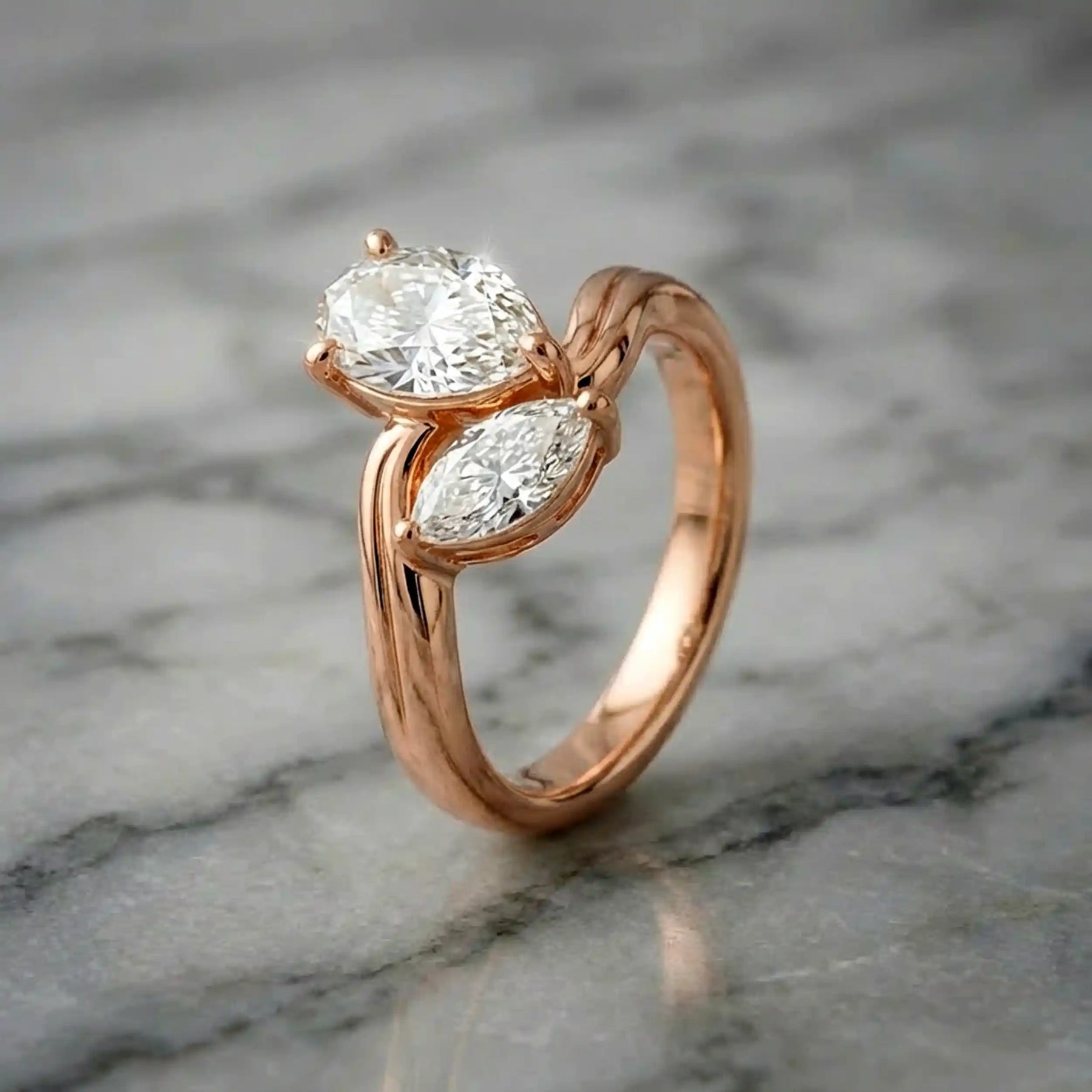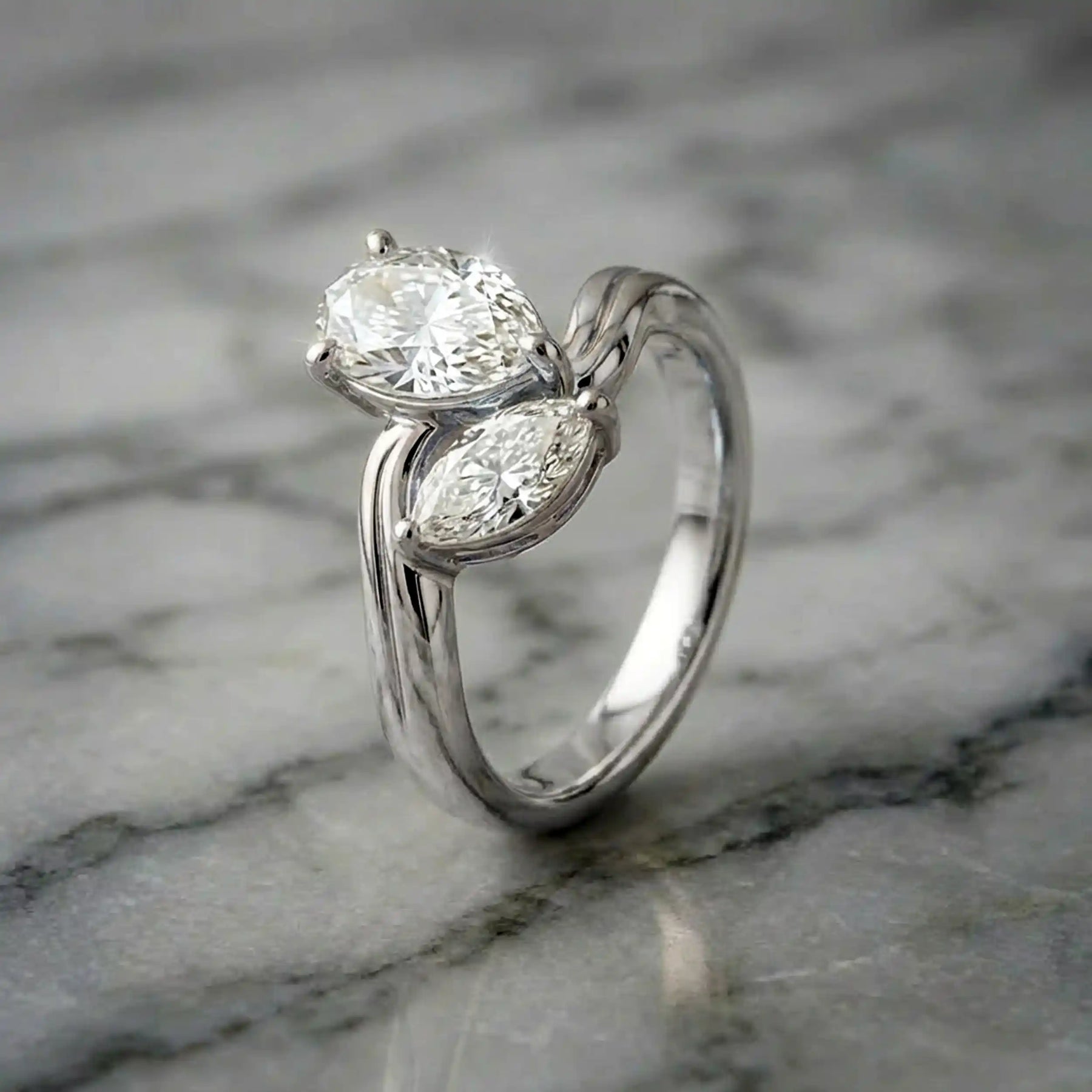 This lab-grown diamond Toi et Moi solitaire engagement ring is a celebration of love, connection, and individuality. Featuring a stunning 1 carat pear-shaped diamond paired with a 0.5 carat marquise diamond, the design represents two lives meeting as one.