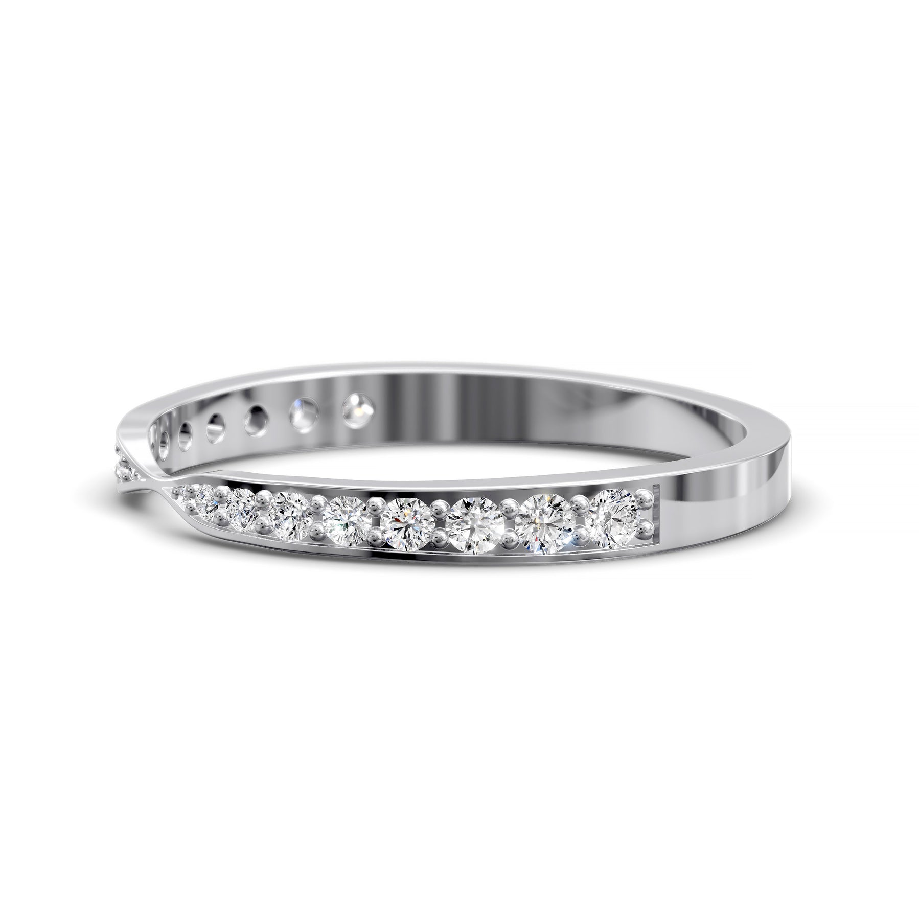 A sleek channel-set tapered top wedding band designed for smooth comfort, refined brilliance and timeless everyday elegance.