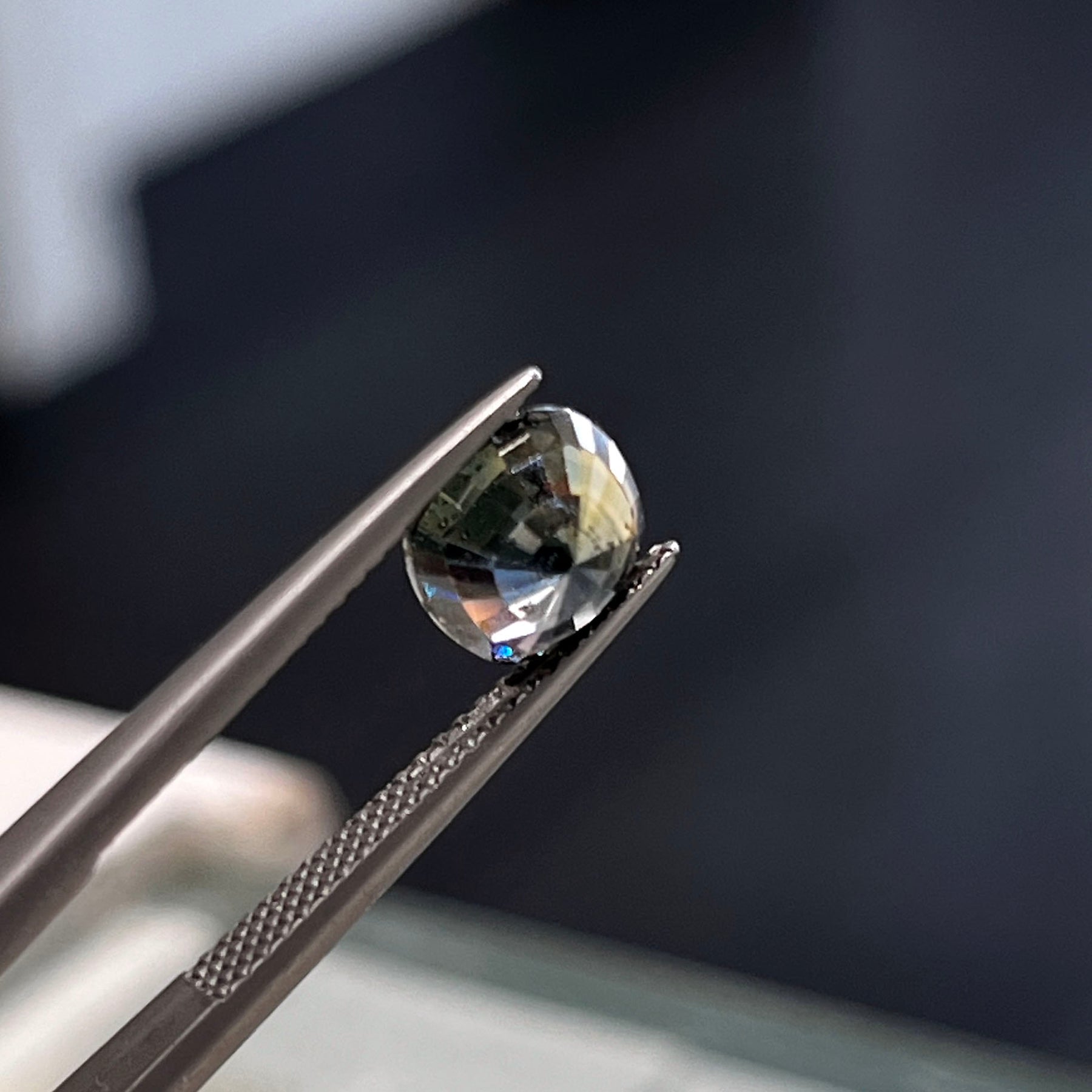 This certified natural sapphire weighs 2.85 carats and displays a remarkable color-change effect, shifting from dark greenish blue in daylight to bluish violet in incandescent light (approx. 75% color change). Its cushion mixed cut, measuring 7.77 x 7.30 x 5.50 mm, highlights the gem’s brilliance and enhances its dramatic shift in color.