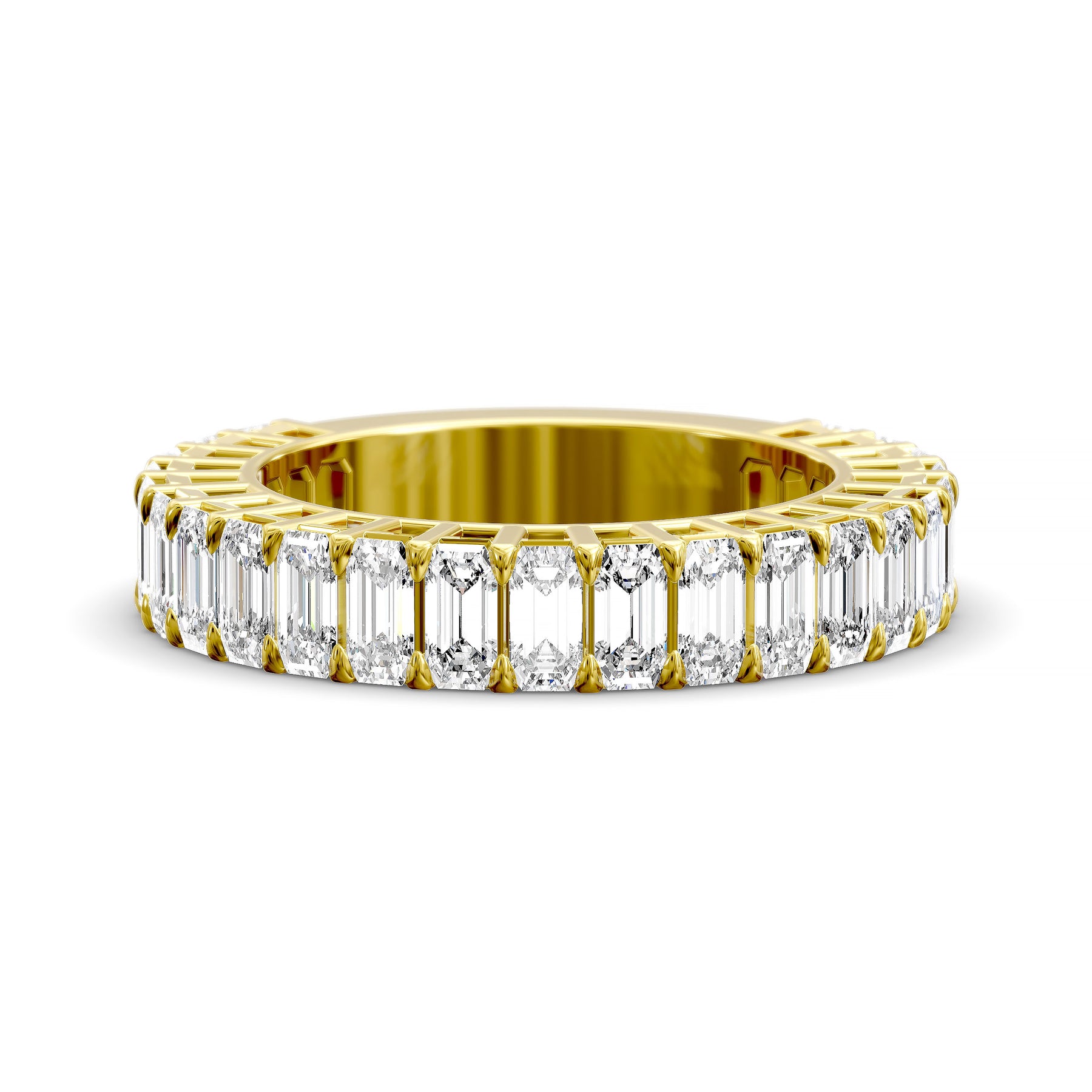 Introducing the Emerald-Cut Shared-Prong Three-Quarter Eternity Band – a modern diamond ring featuring sleek emerald-cut stones set in an elegant shared-prong layout. The long facets and clean geometry create a bright, mirror-like shine that feels contemporary yet timeless.