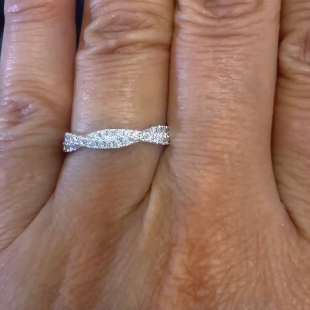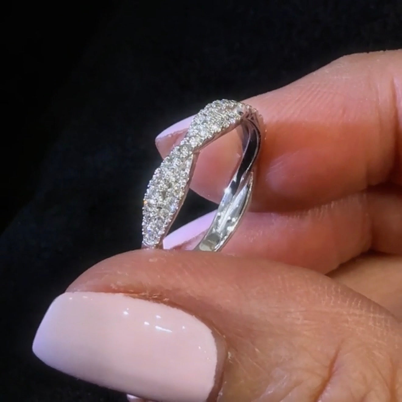 This exquisite twisted wedding band showcases a modern design with timeless elegance. The band features a seamless twist where two diamond-lined sections are laid side by side, forming a unique braided appearance with no gaps. The lab-grown diamonds, arranged in a half-eternity style, shimmer brilliantly and enhance the intricate design. Perfectly blending sophistication with a contemporary twist, this ring is ideal for weddings, anniversaries, or as a statement of style. The smooth and polished underside ensures a comfortable fit, making it as practical as it is beautiful.