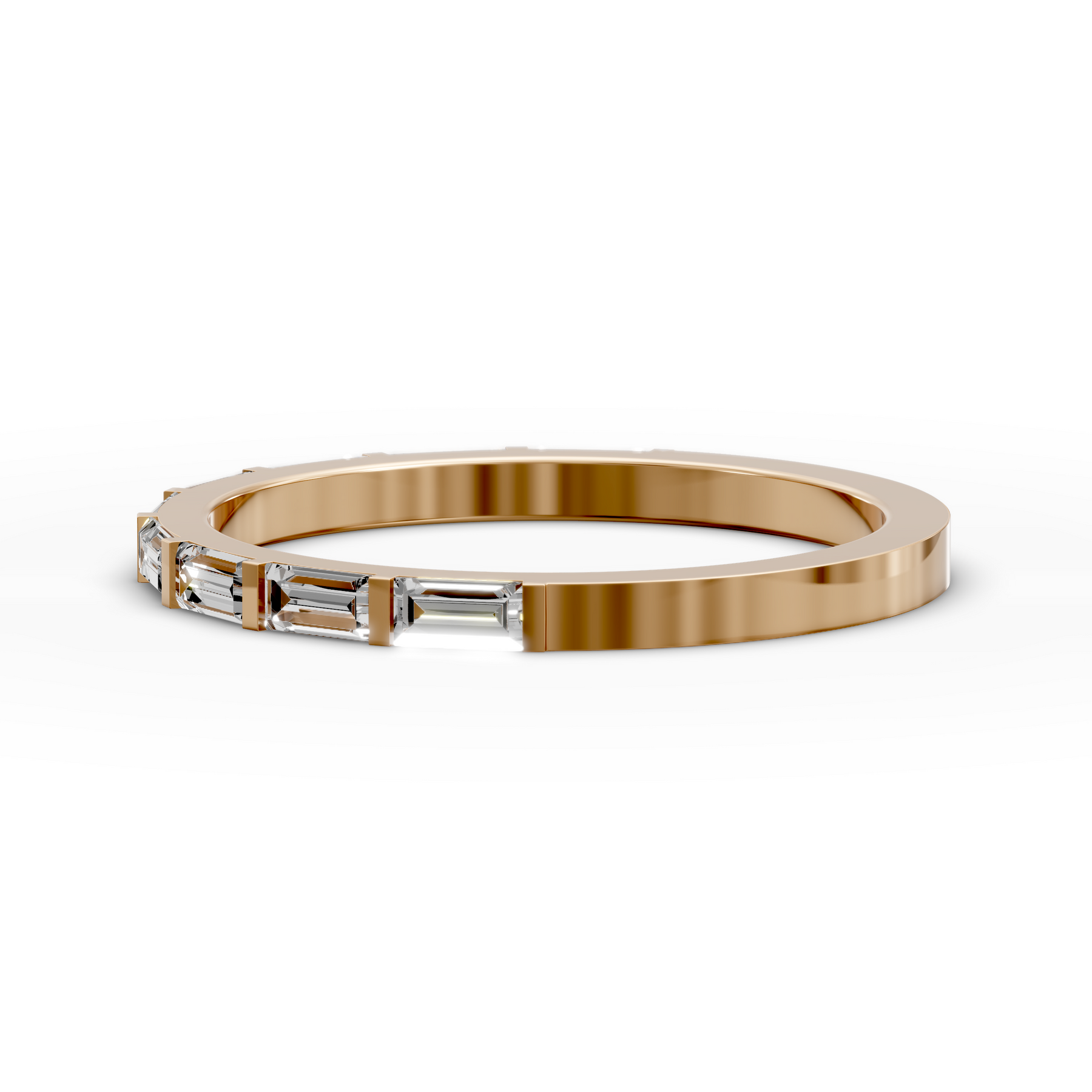 This elegant baguette bar-set half eternity band features a sleek, modern design showcasing baguette-cut stones meticulously secured in a horizontal bar setting. The minimalist silhouette highlights the brilliance of each stone while maintaining a refined, timeless appeal. Perfect as a women’s wedding band or matching band, this piece pairs beautifully with engagement rings or shines gracefully when worn alone.