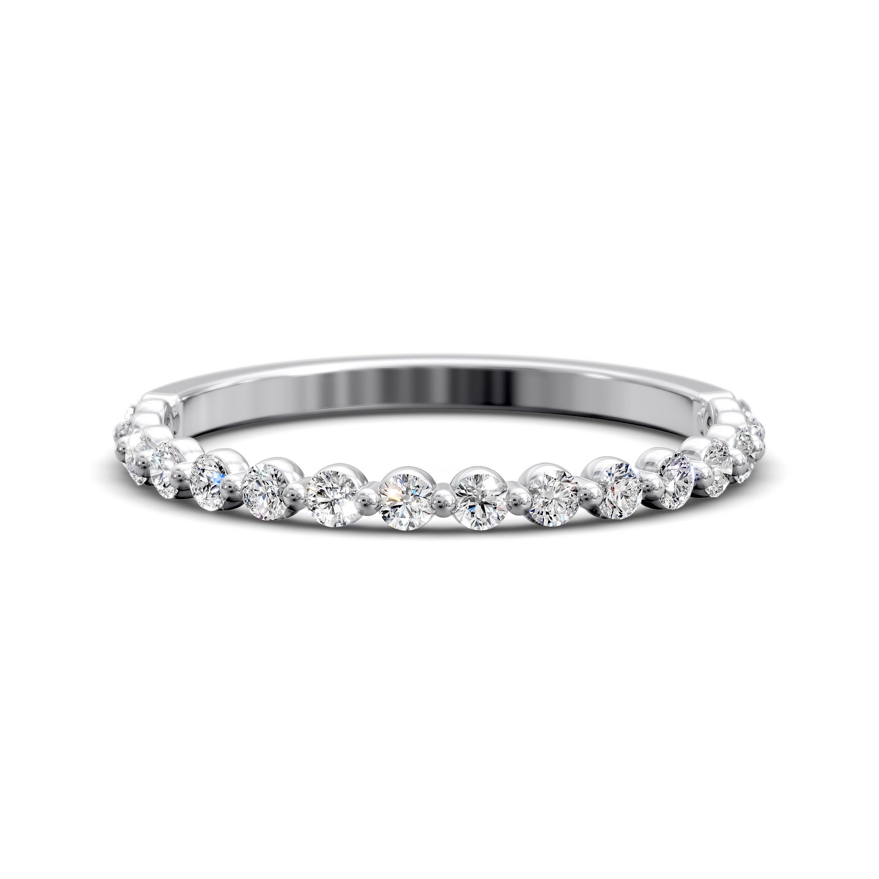 This floating diamond shared prong wedding band radiates timeless sophistication with its delicate row of round brilliant stones that appear to float effortlessly along the band. Designed for both standalone wear and as a matching band, its minimalist yet luxurious profile complements engagement rings beautifully. Available in gold and platinum, this piece can be customized with your choice of moissanite, lab-grown diamond, natural diamond, or gemstone to suit your personal style. Perfect for brides who love refined sparkle and seamless stacking.
