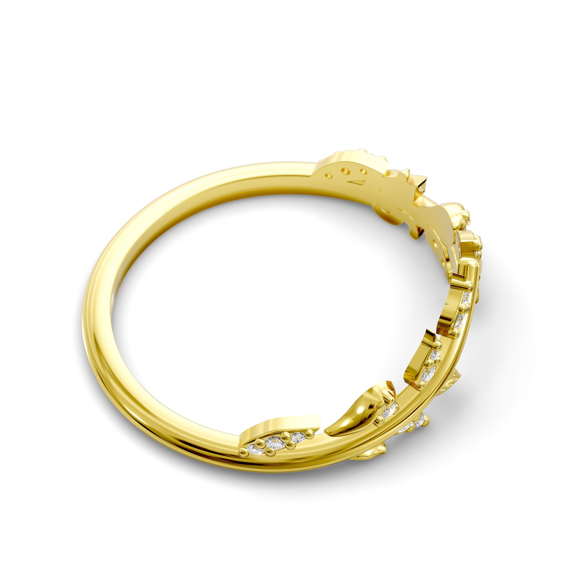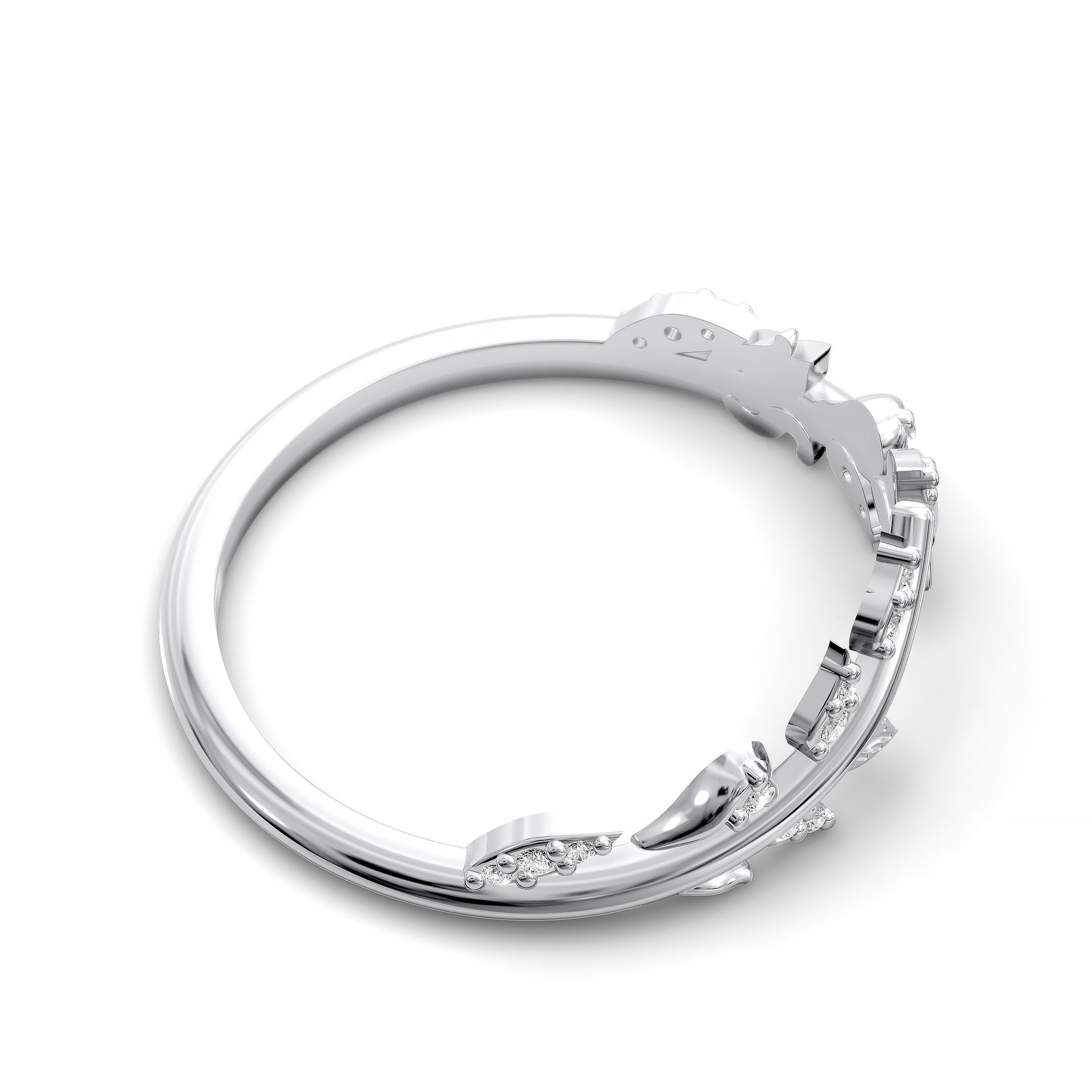 V-shaped nature-inspired wedding band with leaf motifs and round stones