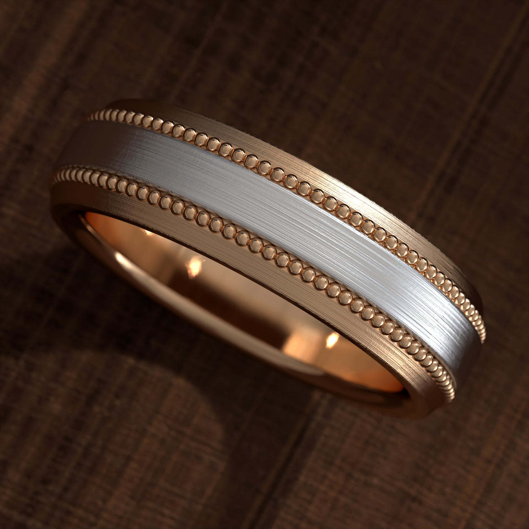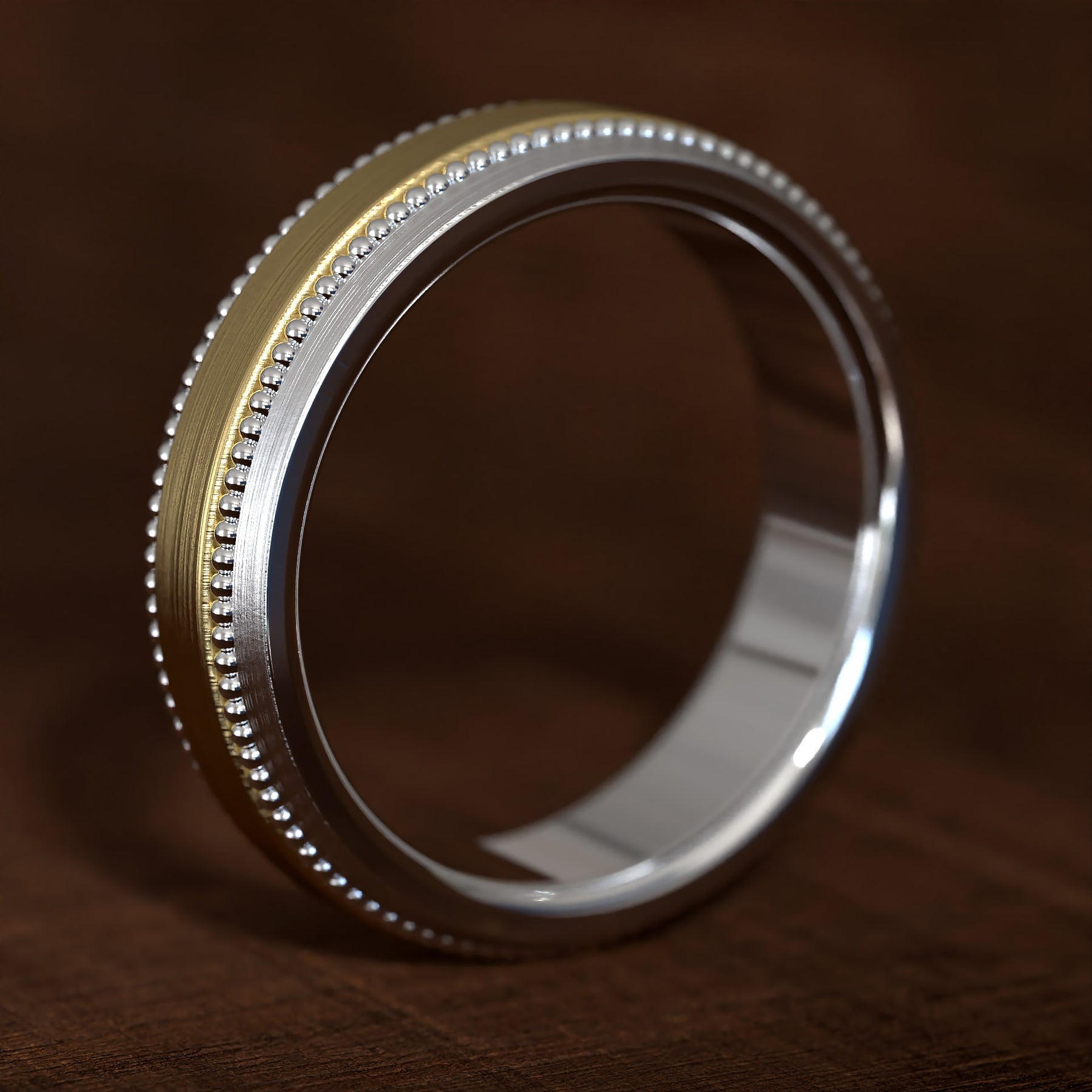 Elevate your style with this refined two-tone hammered center band, beautifully accented with detailed milgrain edges. The contrasting tones create a timeless design that blends modern craftsmanship with classic sophistication. The hammered center texture adds depth and character, while the milgrain detailing provides an elegant, vintage-inspired touch.