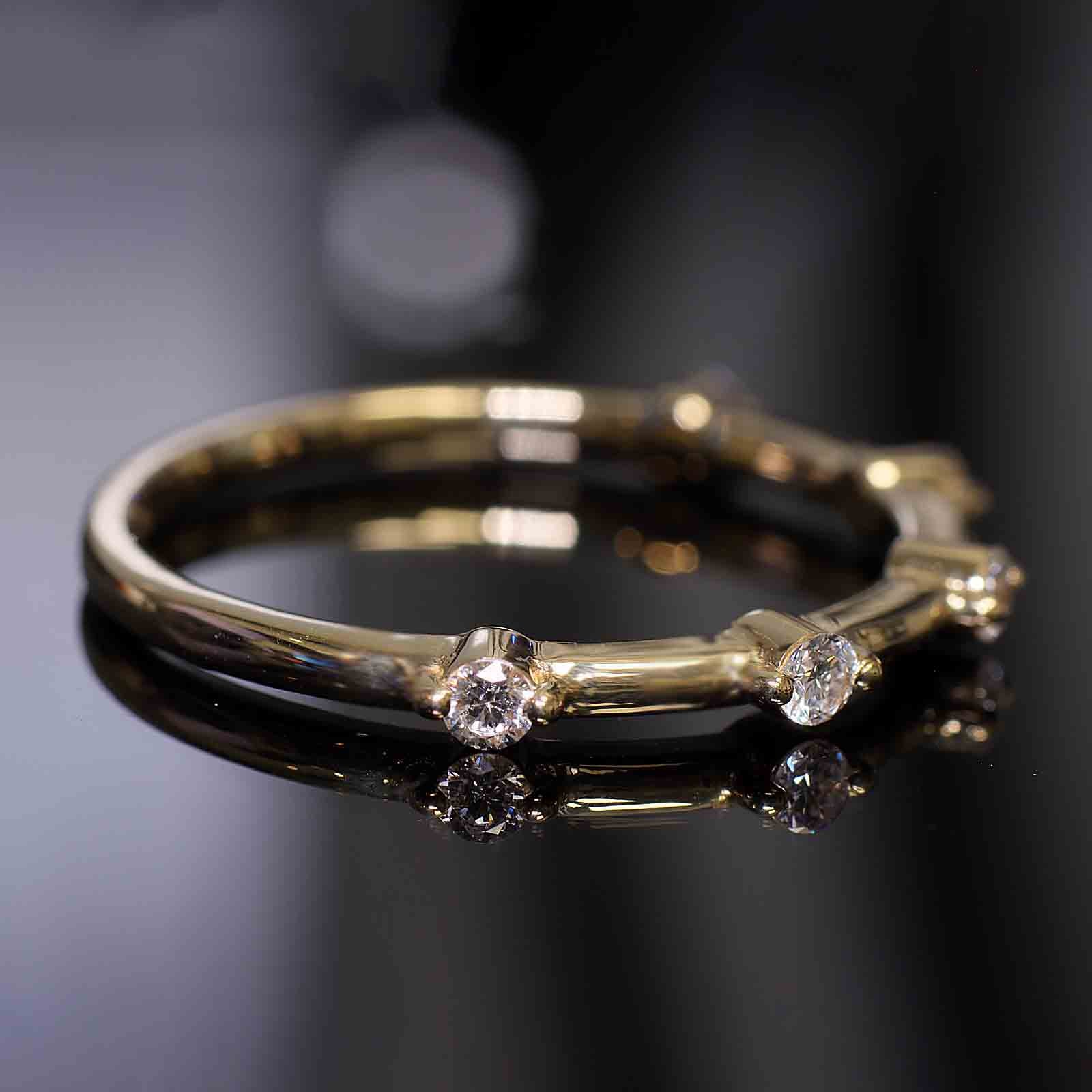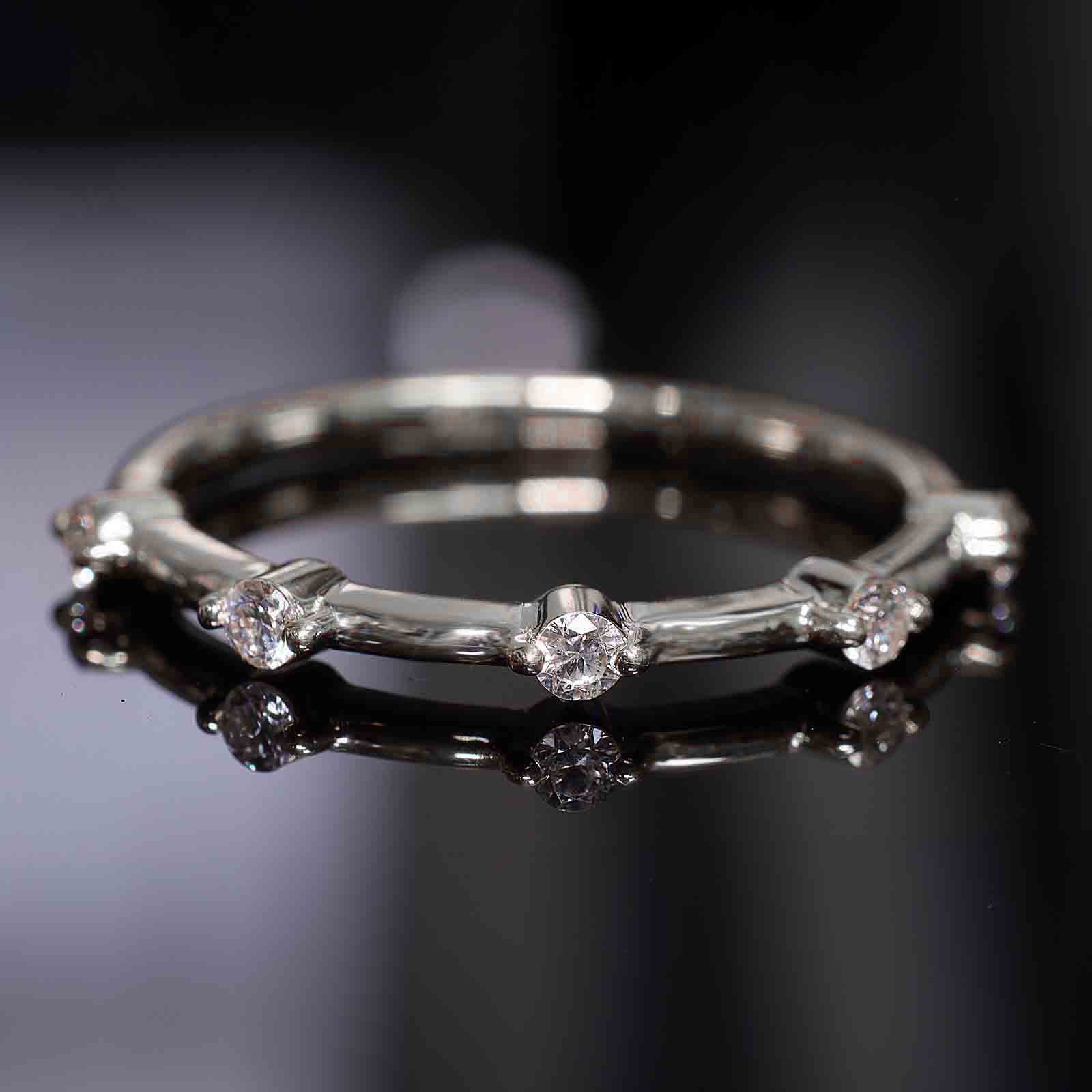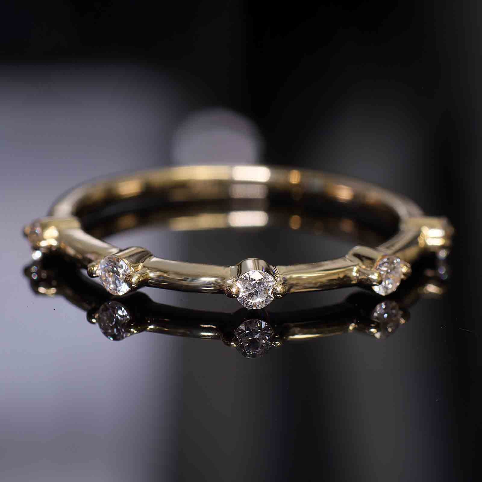 Elevate your commitment with this exquisite lab-grown diamond station wedding band. This band offers a modern and refined look, featuring carefully spaced, brilliant diamonds held securely in beautifully crafted round prongs. The delicate spacing between each stone adds a contemporary touch, creating an understated yet captivating sparkle. Each diamond is positioned to maximize light reflection, enhancing the band's elegance and sophistication.