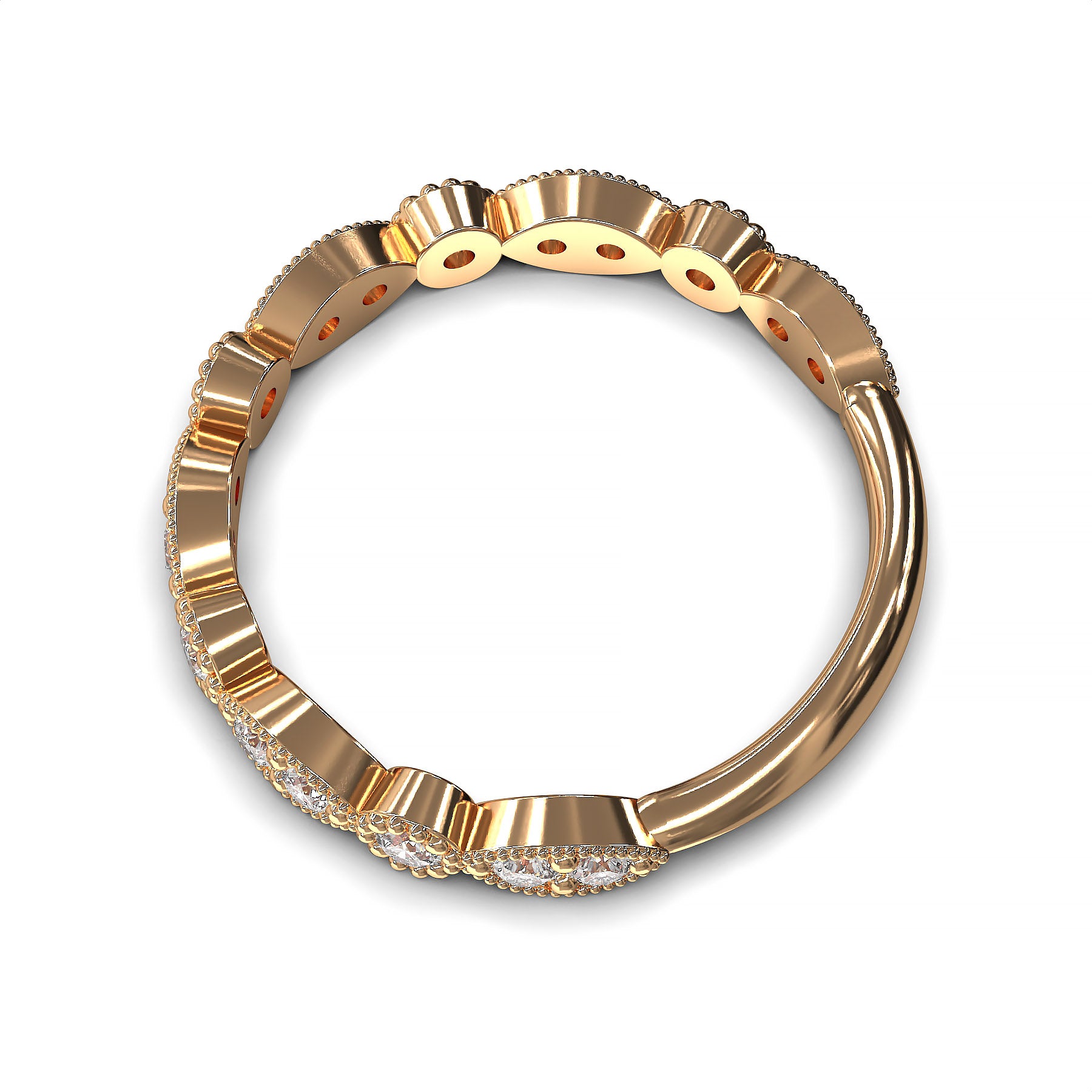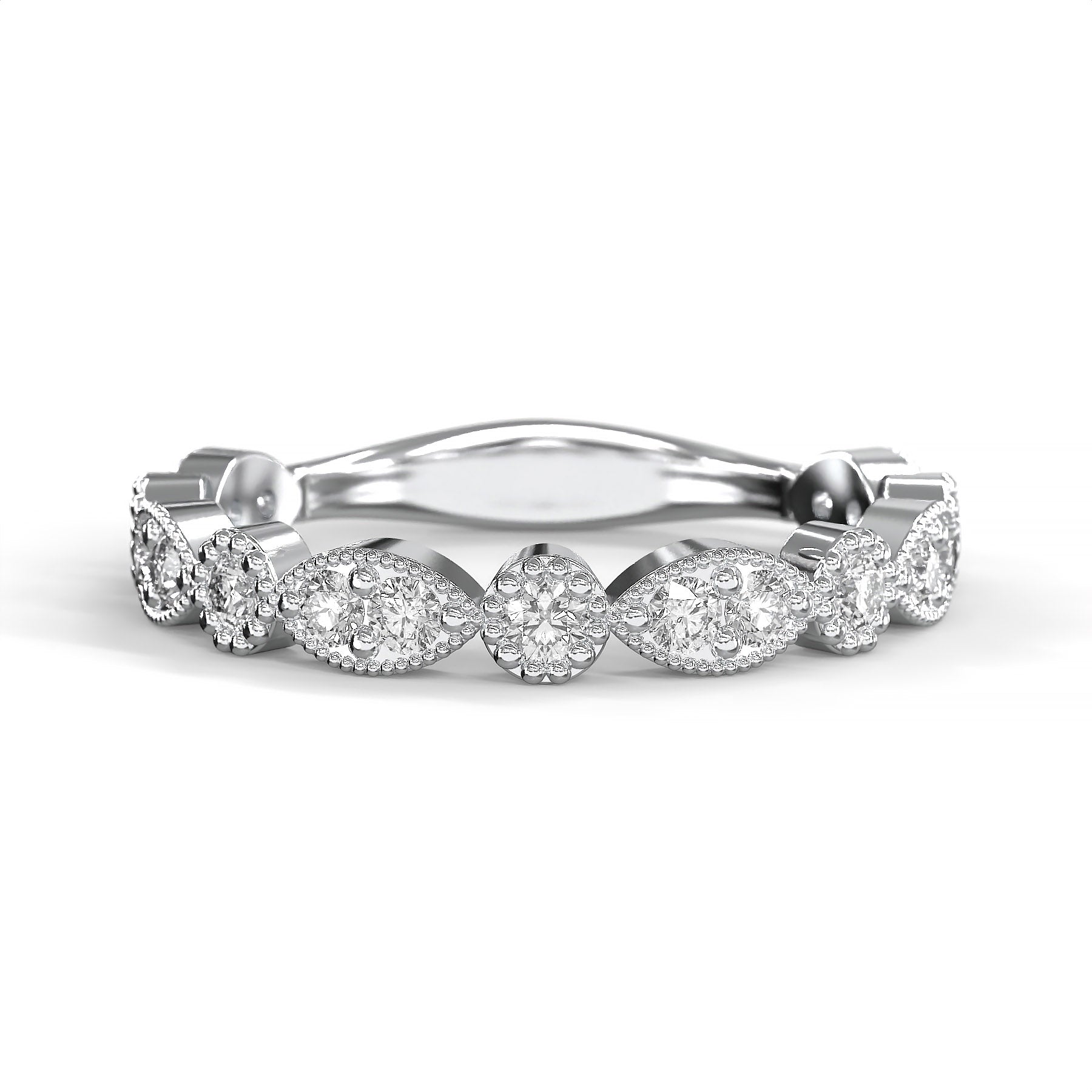 This vintage-inspired diamond accent band features a captivating sequence of marquise and round-shaped bezels, each set with shimmering round-cut diamonds. Delicate milgrain edging frames every setting, lending the piece an antique charm and refined texture. Designed with diamonds across the top portion of the band, it offers a balanced blend of elegance and comfort—perfect for wearing alone, stacking with other rings, or pairing with an engagement ring. Its timeless design makes it an ideal choice for weddings, anniversaries, or everyday elegance.