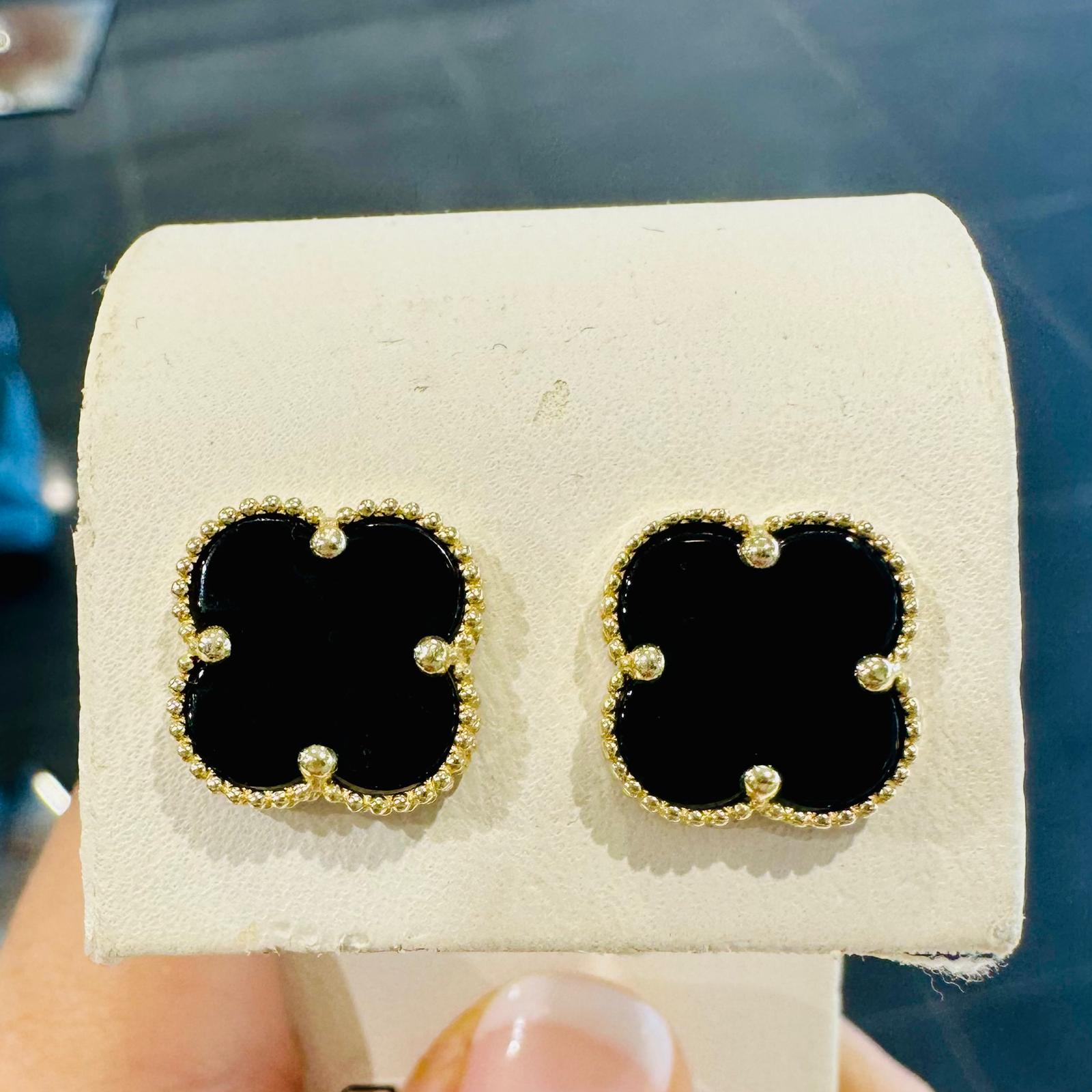 Add a touch of refined elegance to your collection with these 10K gold flower stud earrings, masterfully crafted in a Van Cleef-inspired clover silhouette. Featuring rich black onyx inlays, these earrings reflect classic beauty with a bold modern edge. The floral clover shape, paired with the beaded yellow gold border, offers a timeless and feminine design.