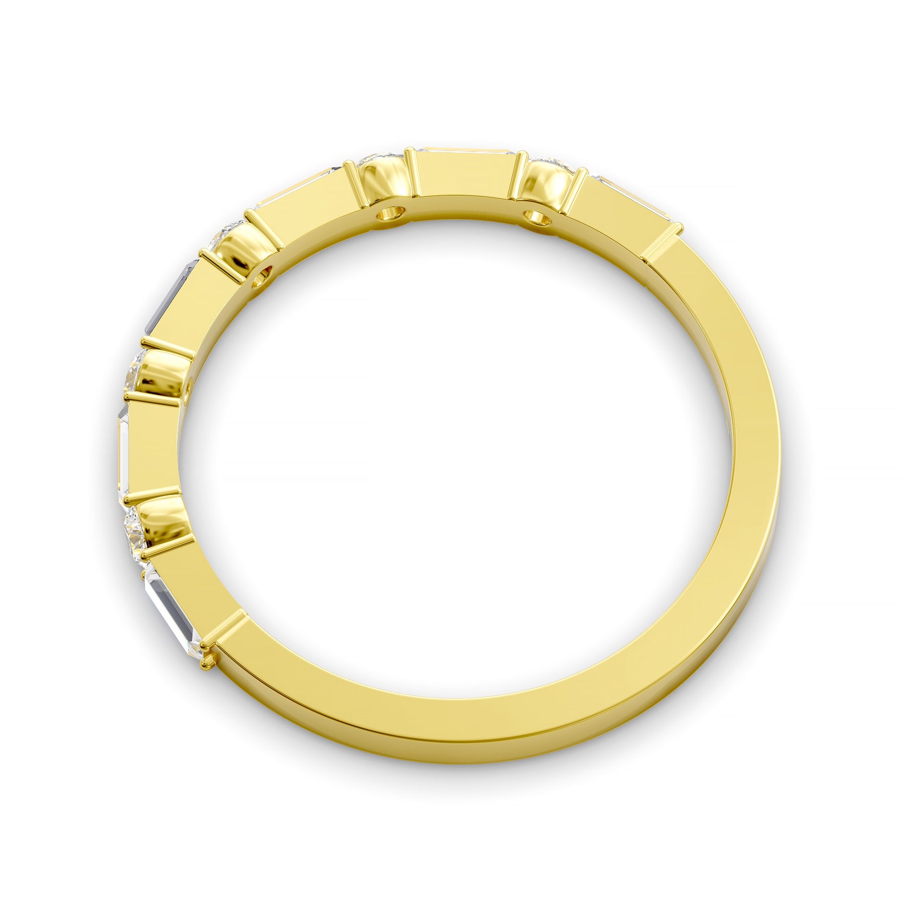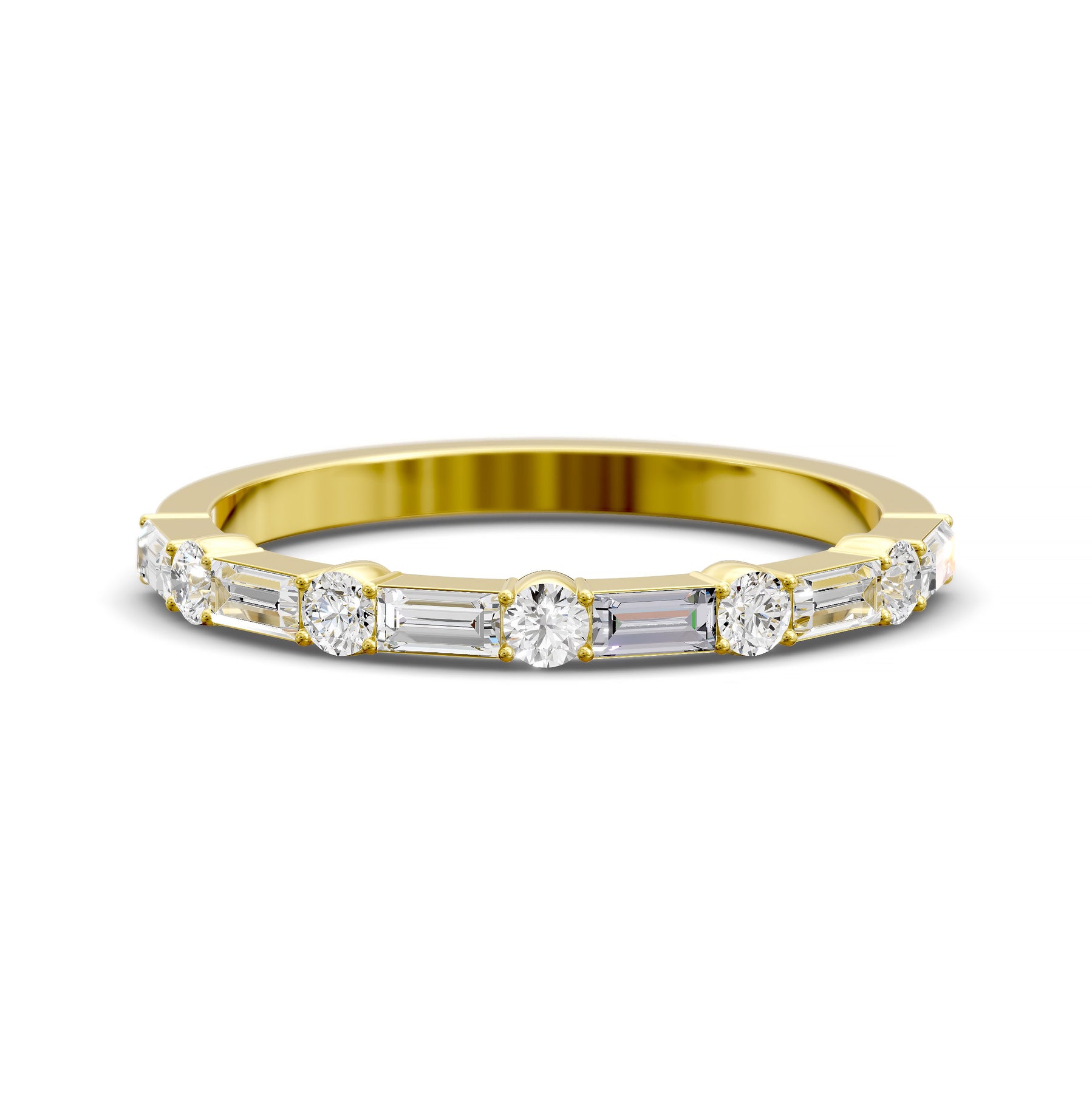 Modern gold wedding band with alternating round and baguette-cut diamonds
