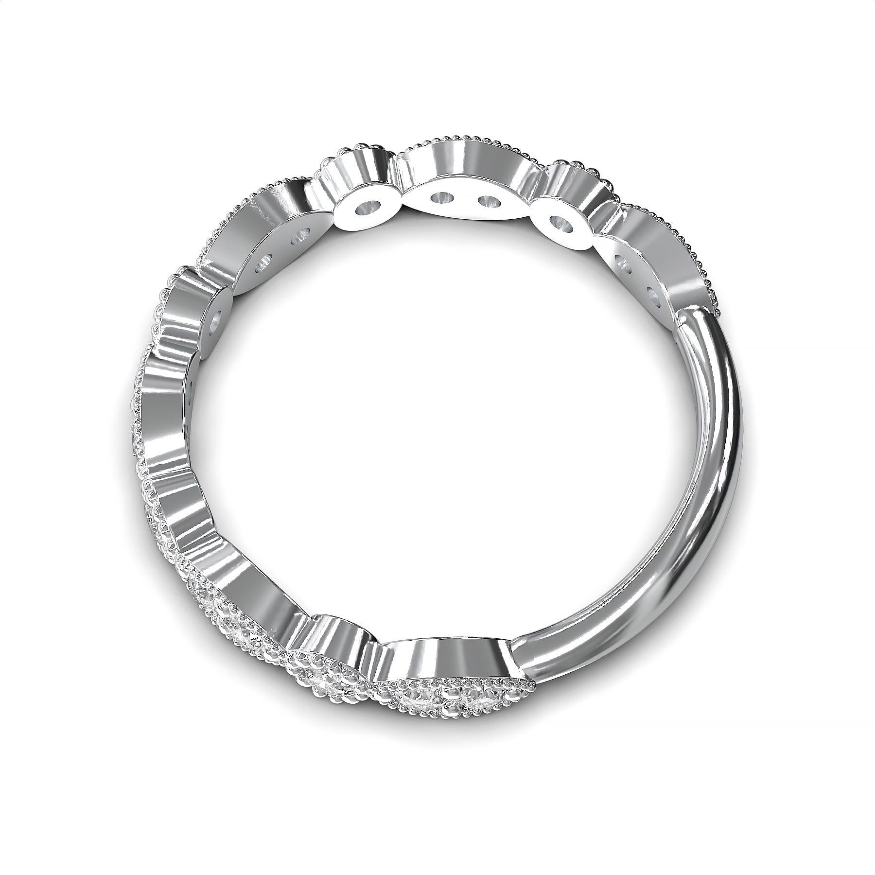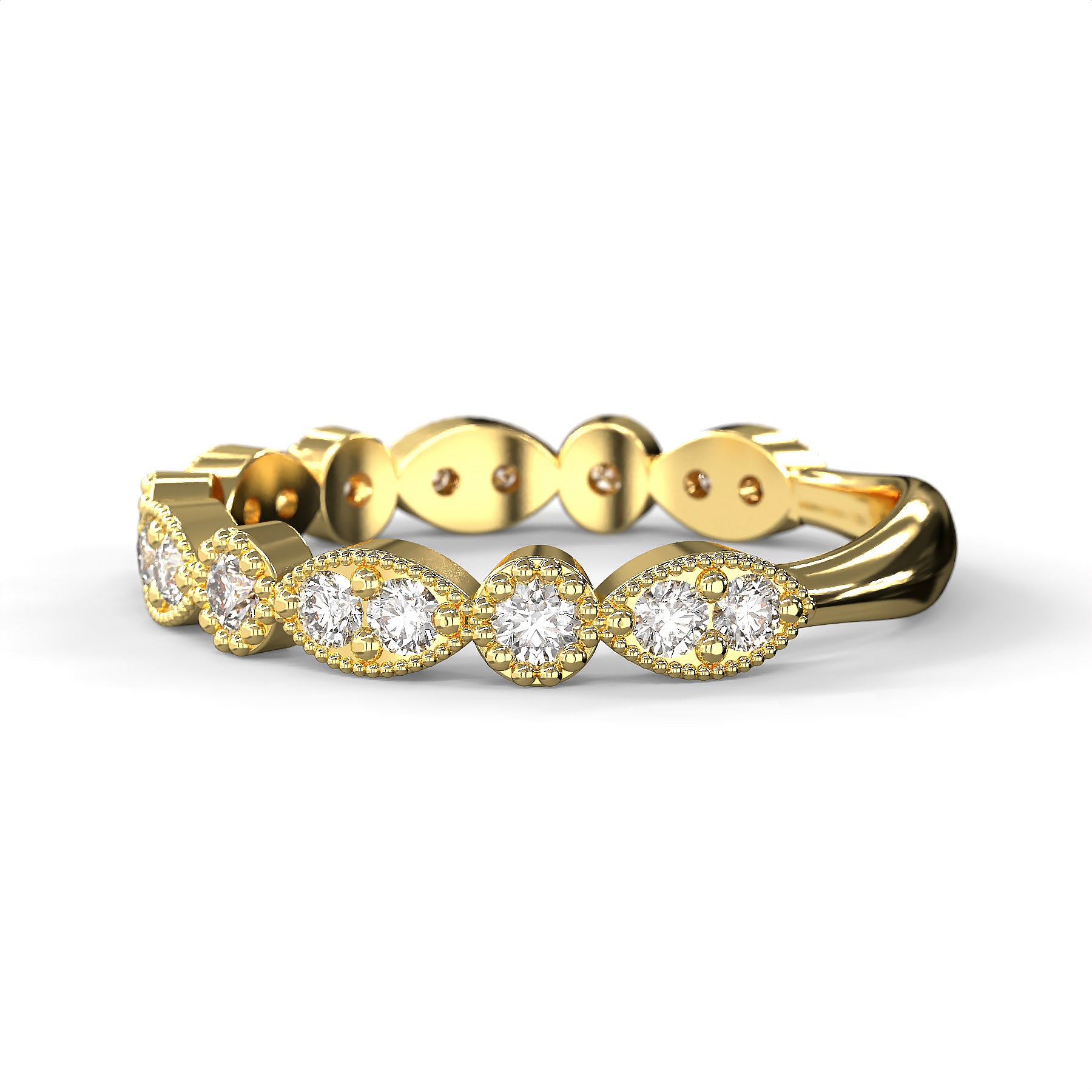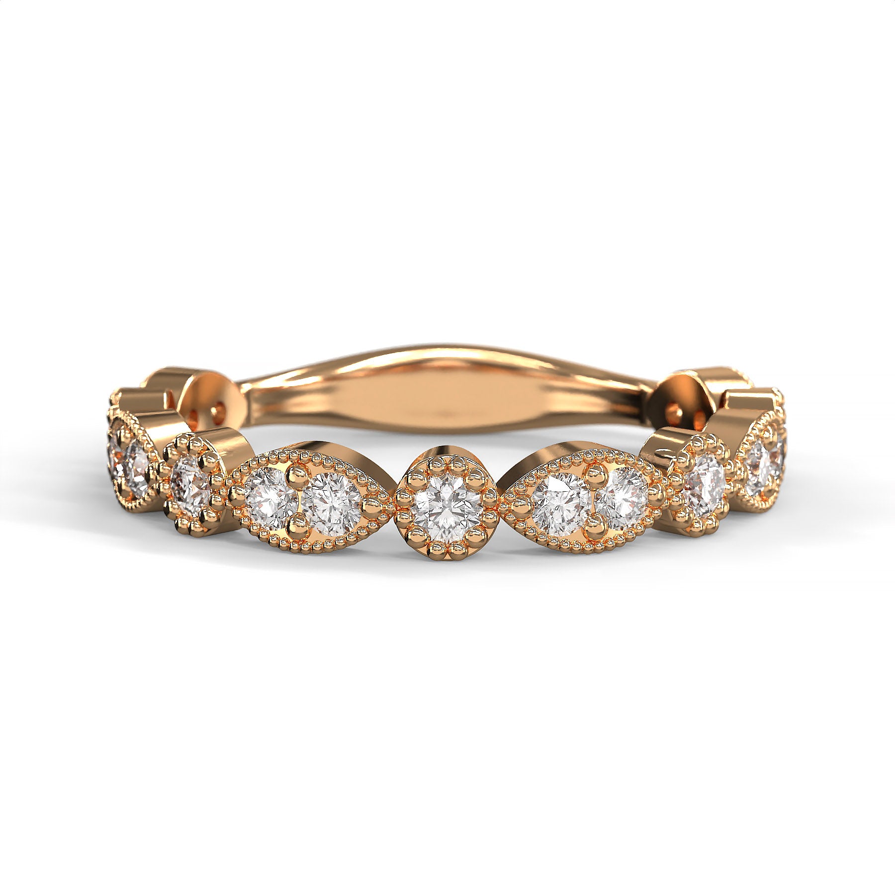 This vintage-inspired diamond accent band features a captivating sequence of marquise and round-shaped bezels, each set with shimmering round-cut diamonds. Delicate milgrain edging frames every setting, lending the piece an antique charm and refined texture. Designed with diamonds across the top portion of the band, it offers a balanced blend of elegance and comfort—perfect for wearing alone, stacking with other rings, or pairing with an engagement ring. Its timeless design makes it an ideal choice for weddings, anniversaries, or everyday elegance.